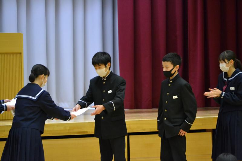 12月25日(金)、2学期の終業式が行われました。式に先がけて表彰披露がありました。給食委員会主催のワゴンコンテスト(給食用ワゴンをきれいに片付けるコンテスト)の表彰もありました。