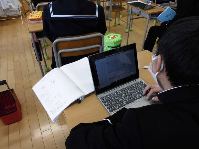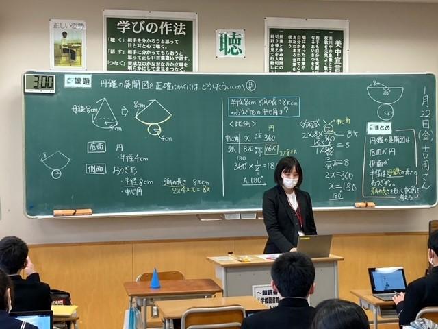 1月22日、数学科 小竹教諭の研究授業が1年生の教室で行われました。「円錐の展開図を正確にかくにはどうしたらいいか」という課題について、底面の円周と扇形の弧の長さが同じになることや、扇形の中心角はどのようにもとめるか、などこれまで学んできたことを駆使して考えていました。本時の授業のまとめとして、一人一台ずつ配られたタブレット端末を用いて、演習を行っていました。生徒の思考力を育てるための授業のあり方や方法について学ぶ有意義な研究授業、研修会となりました。