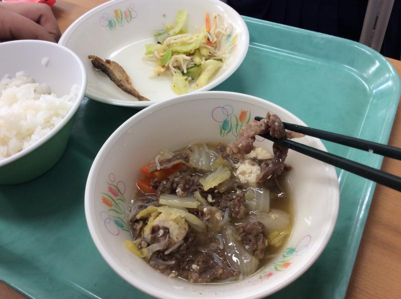 能登牛の消費を助けるための「能登牛給食シリーズ」第3弾はすき焼きでした。(1回目はピビンバ、2回目は牛丼)甘い脂がたっぷりでした。生徒たちは「すごくおいしい」「高級な味がする」「上品です!」と、石川県が誇るブランド牛の味を堪能しました。