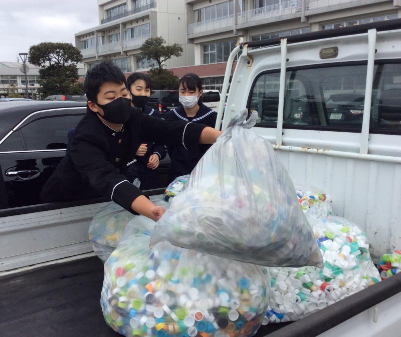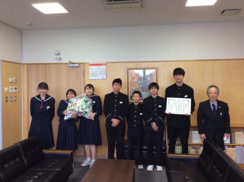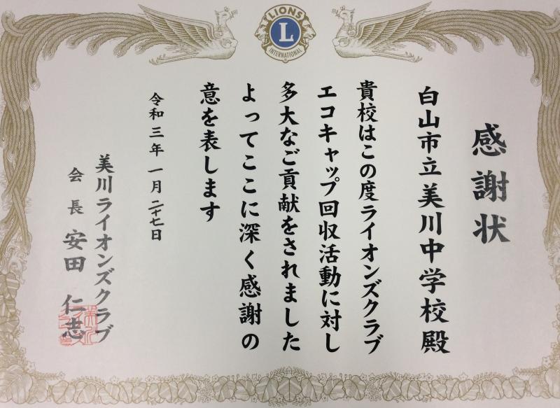 本校の生徒会の取組の一つに「エコキャップ回収」があります。毎年、集まったエコキャップは美川ライオンズクラブの方に引き取ってもらいます。今日はそのライオンズクラブの方から感謝状をいただきました。エコキャップは430個で10円になり、860個でポリオワクチンが購入でき、発展途上国と言われる国の子ども一人の命が救われます。私たちの日常の小さな行動が集まり大きな力となるのですね。