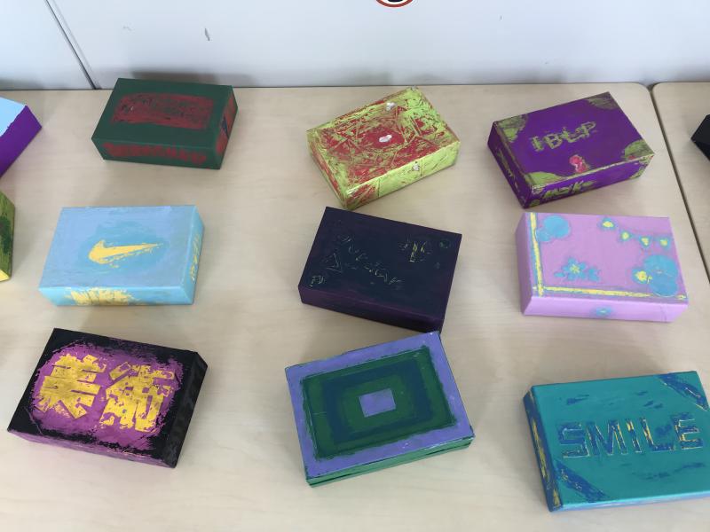 1年生の美術では輪島塗などの伝統工芸で用いられる技法を学び、箱の加飾を行いました。二重・三重に彩色した後にやすりを使って削り、下の色を浮き上がらせるという技法です。