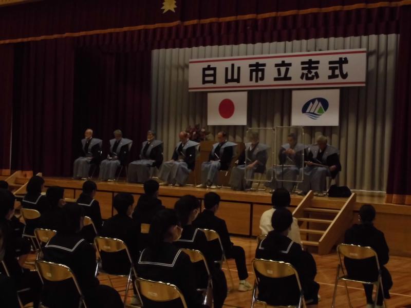 2月4日(木)の午後、本校体育館で立志式が行われました。式に先立ち、御酒(ごんしゅう)保存会の皆さんが、美川に伝わる祝い謡「御酒」を披露してくださりました。式の中では、川端凛さんが市民憲章の朗読を行いました。その後、ご来賓の方々からお祝いの言葉をいただき、最後に生徒を代表して坂下耀介さんが「立志の言葉」を力強く言いました。
