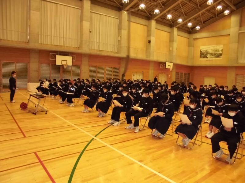 終業式では校長先生から、生徒の成長を喜ぶ話や来年に向けての激励がありました。全校集会では、冬休みの生活について、またスクールカウンセラーからのメッセージが紹介されました。