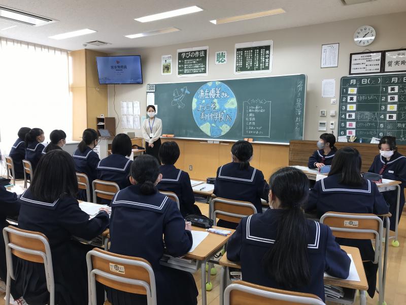 本日が美川中での最後の勤務ということで、授業終了後、臨時で離任式を行いました。離任式では、キャサリン先生から英語と日本語でメッセージをもらった後、全校生徒を代表し、生徒会長がお別れの挨拶をしました。挨拶の最後には、全校生徒が声をそろえて「Thank you,Katherine!」と感謝の気持ちを伝えました。