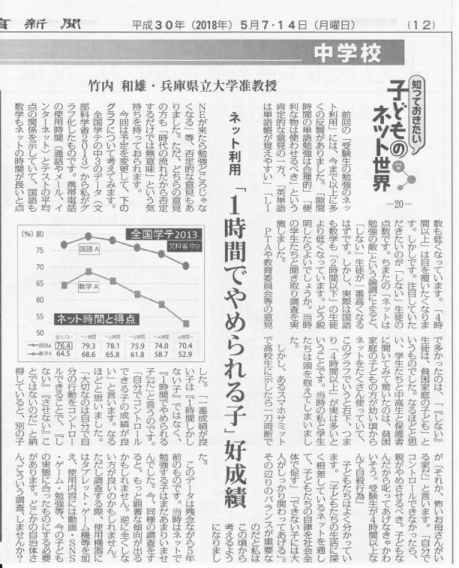 この臨時休業中、会議や学習保障にwebを利用することが多くありました。そして私は、今まで以上にITCの必要性と可能性を強く感じました。子どもたちの時代は、それは益々、大きくなっていくことでしょう。そういう時代に生ていく子どもたちに、ICTに支配されず、正しく使いこなせる力をつけてあげることが必要です。記事の中にあるような「1時間でやめられる子」を育てていくことが大切なのです。(平成30年5月 読売新聞より)