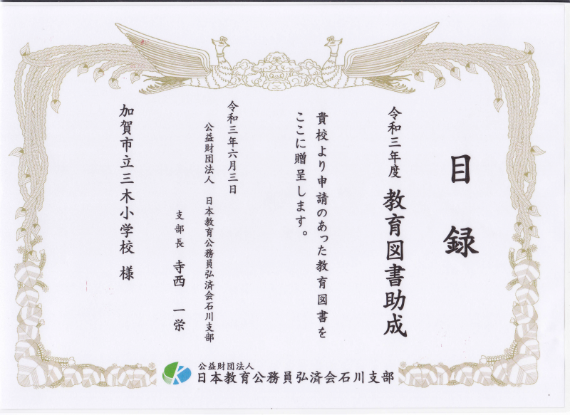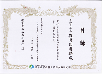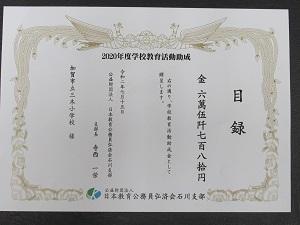 2020年7月27日 14時43分公益財団法人日本教育公務員弘済会石川支部様より教育活動助成金をいただきました。本校の学校研究である体育のマットの購入に充てさせていただきます。ありがとうございました。