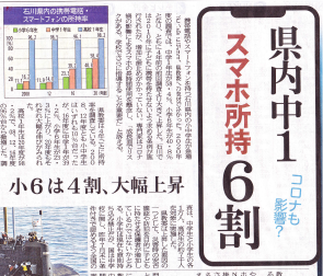 2021年2月10日 14時32分今日の北國新聞にスマホの所持率についての記事が掲載されていました。石川県教育委員会では4年ごとにスマホの所持率の調査をしており、小学生の所持率は2012年には11.9パーセントだったものが、前回の2016年には23.3%に、そして今回は40.8%と急増しているそうです。所持率の増加は、防犯上のこともあるので一概に悪くは言えませんが、持たせた以上はそのあとの使い方をしっかり見守る責任があると思います。youtubeにスマホが子どもたちにどういう影響を与えるのかを東北大学の川島隆太先生が講演されているものがありました。1時間ほどの動画ですが、子どもたちの将来に係わる大切なことを最新のデータを基にお話しされています。ご覧になることをお勧めします。