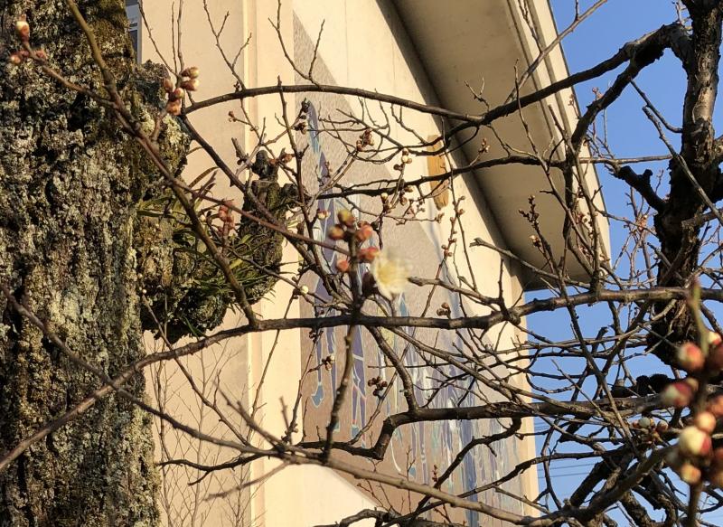 2021年2月22日 09時59分今朝、玄関前の白梅が一輪咲いていました。6年生が登校する日も20日を切りました。春は確実に来ています。