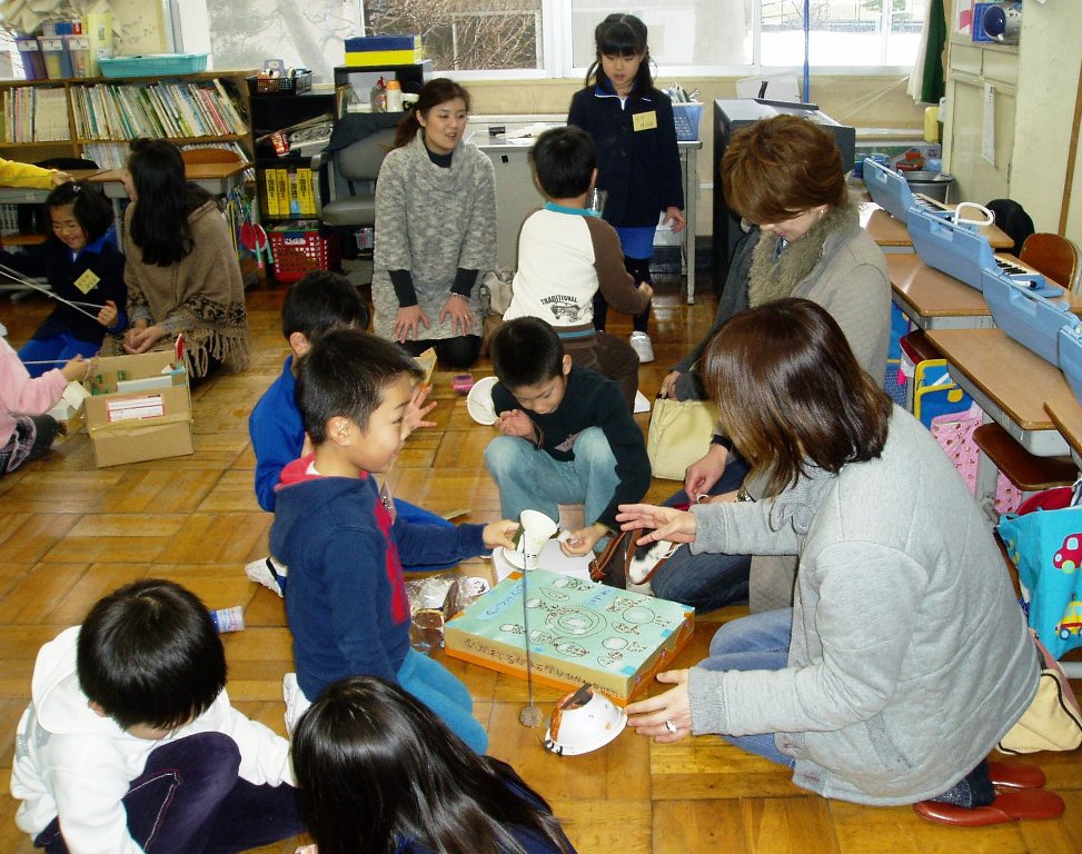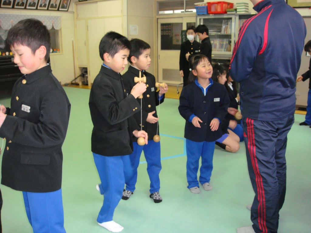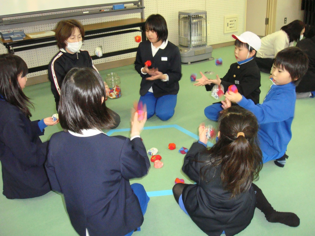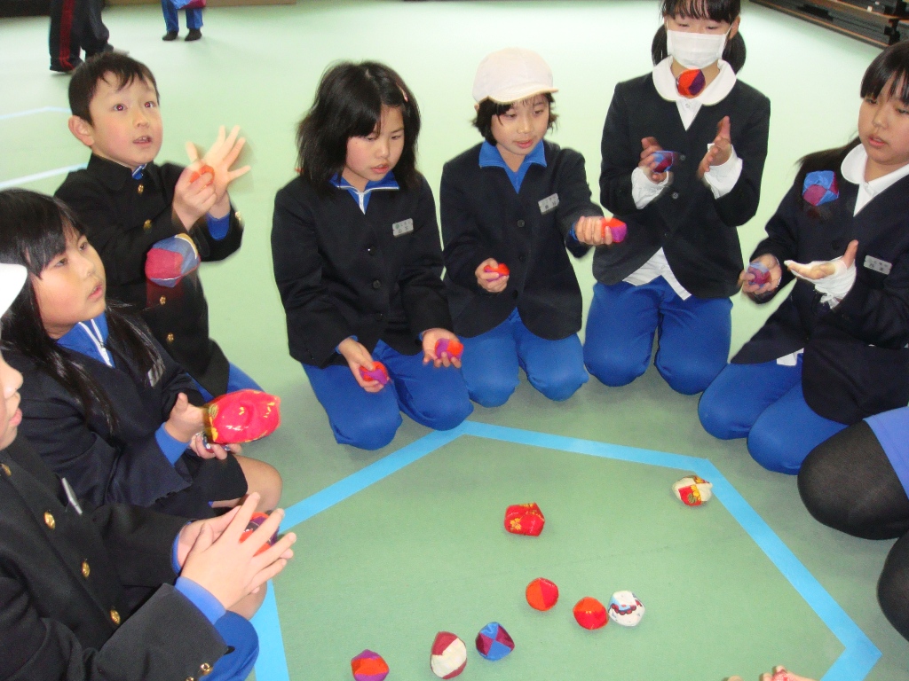 昼休みに、仲良し班の結束を高めるために、4つ班ごとにいろいろな遊びを一緒にしました。昔遊びは、慣れてないけどすぐに夢中になってやっていました。