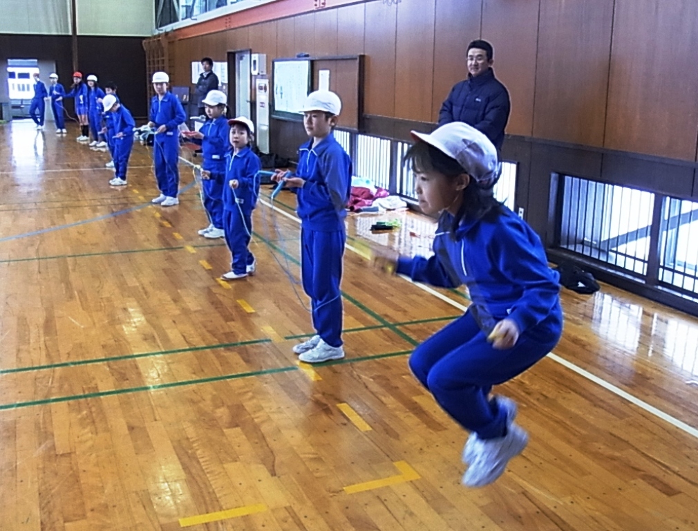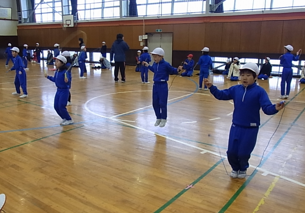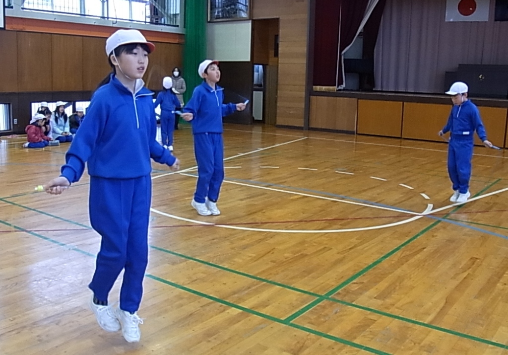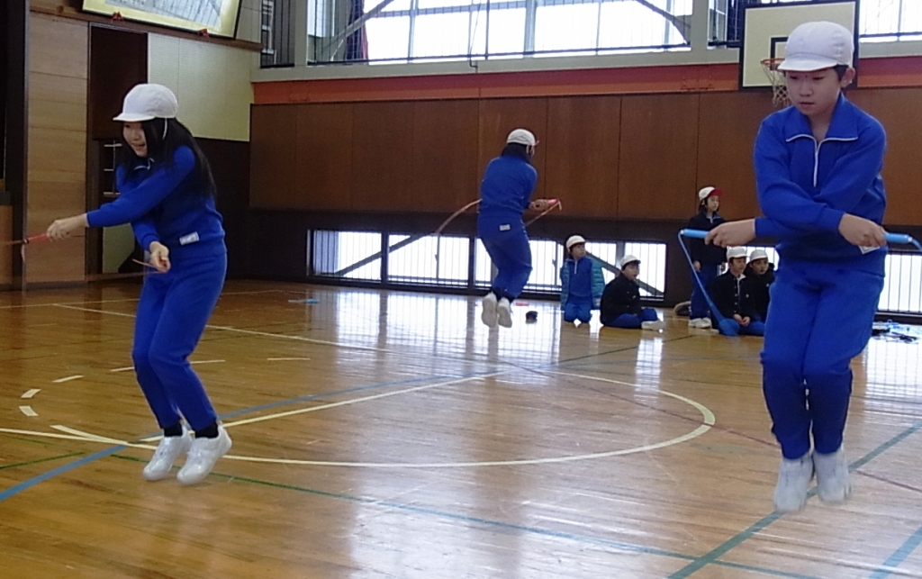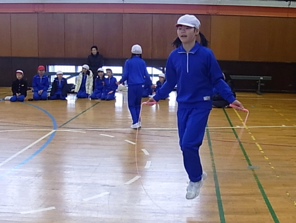 外は雪が降っていましたが、体育館は、白熱した戦いで盛り上がりました。4つの班対向の縄跳び大会は、前跳びリレーや、8の字跳びといった団体種目が特に応援に力が入り楽しい」会となりました。