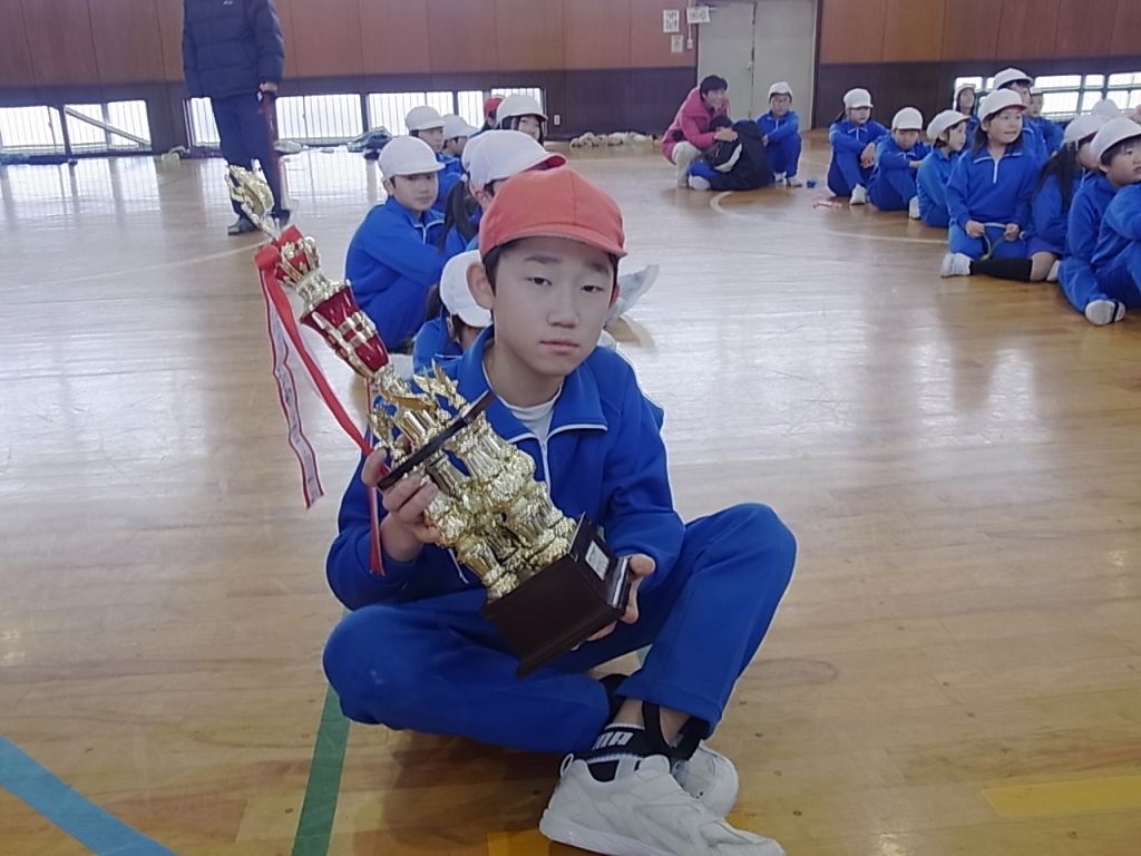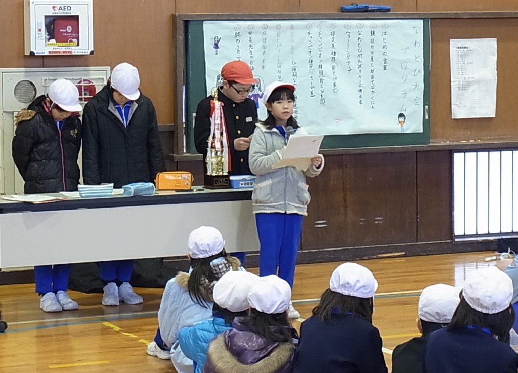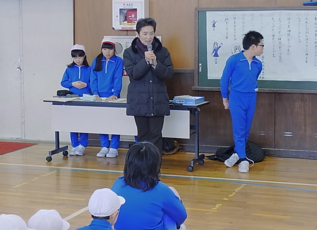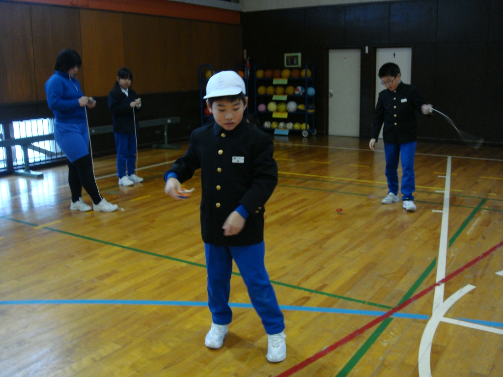 外は雪が降っていましたが、体育館は、白熱した戦いで盛り上がりました。4つの班対向の縄跳び大会は、前跳びリレーや、8の字跳びといった団体種目が特に応援に力が入り楽しい」会となりました。