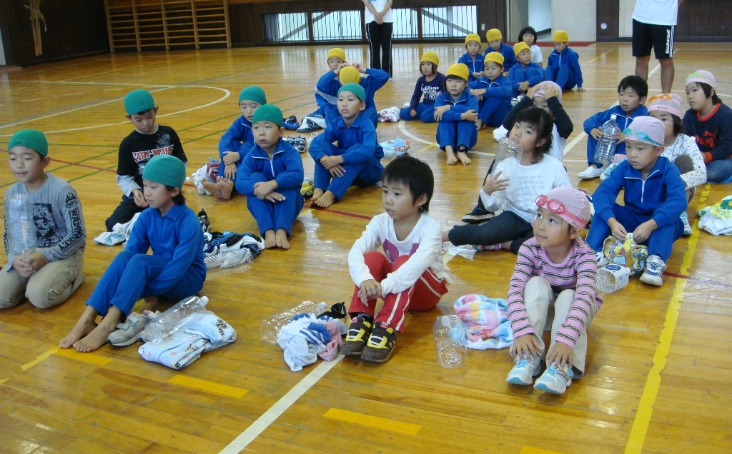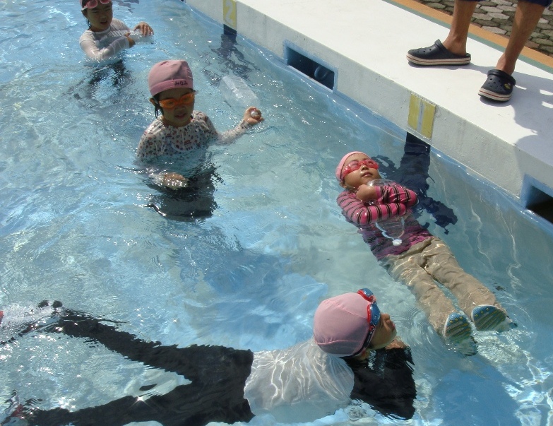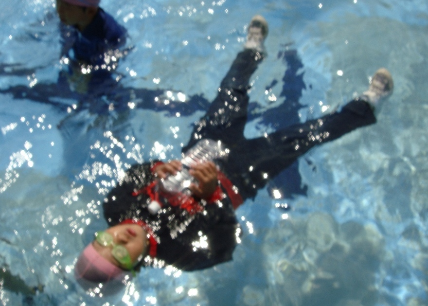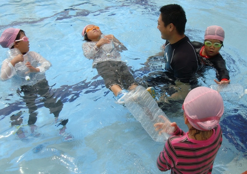 「うあぁ、重い。歩きにくい。」と言いながら、身近なペットボトルを抱えて浮く練習をしました。