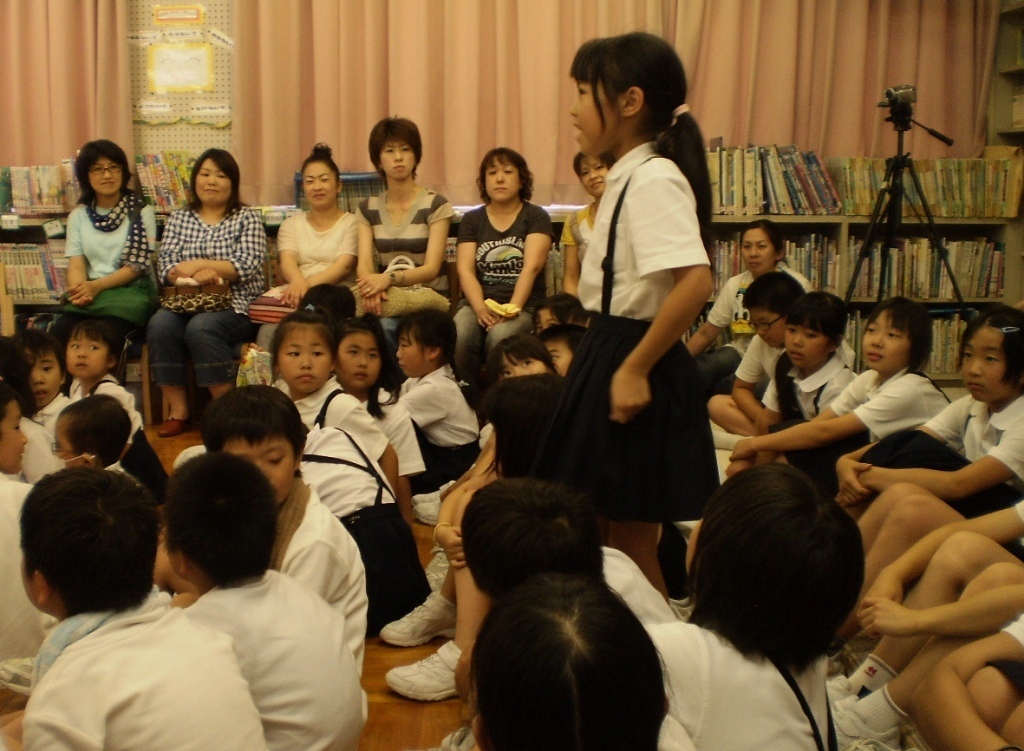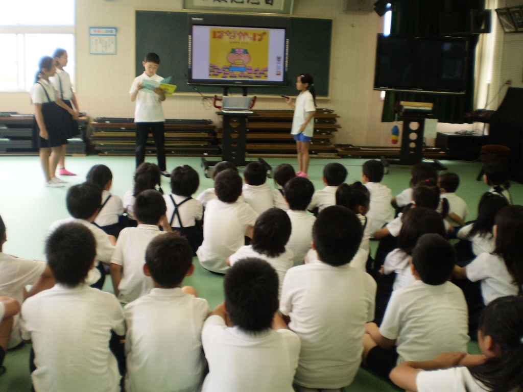 全校児童が集まってくれました。「はながっぱ」という本を図書委員が読みました。