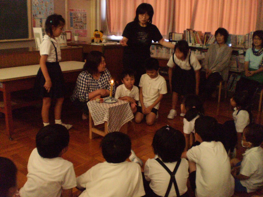 大型絵本を読んでもらった後、ろうそくの明かりが揺れる中