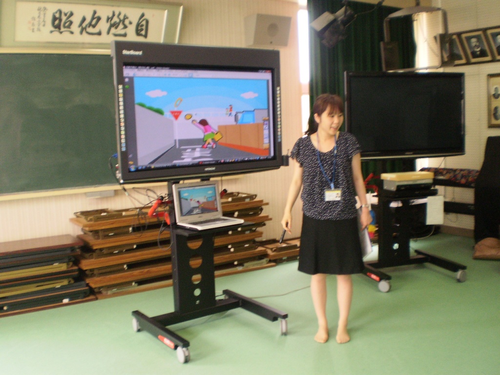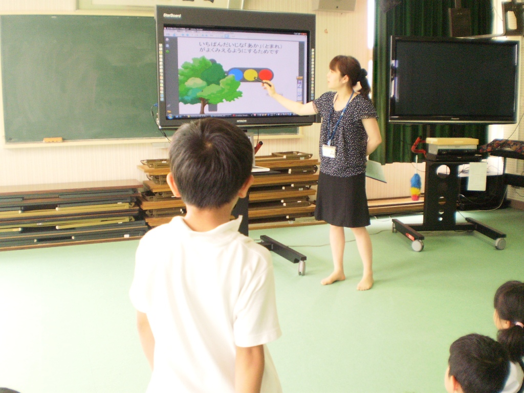 画面を見ながらクイズに答えたり、横断歩道の渡り方を動いてやってみたりして楽しく交通ルールを学んでいました。
