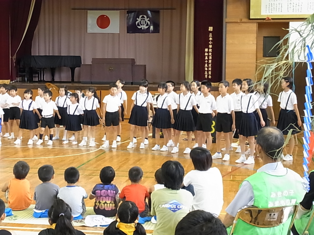 三木小学校には、三木校讃歌と校歌の2つがあります。電子黒板を使い、2つの歌が作られた経緯や歴史を話しました。そして、校歌の歌詞の意味についても説明しました。3題目まで、歌詞に込められた意味を確かめながら、大きな声で校歌を歌って集会は終わりました。