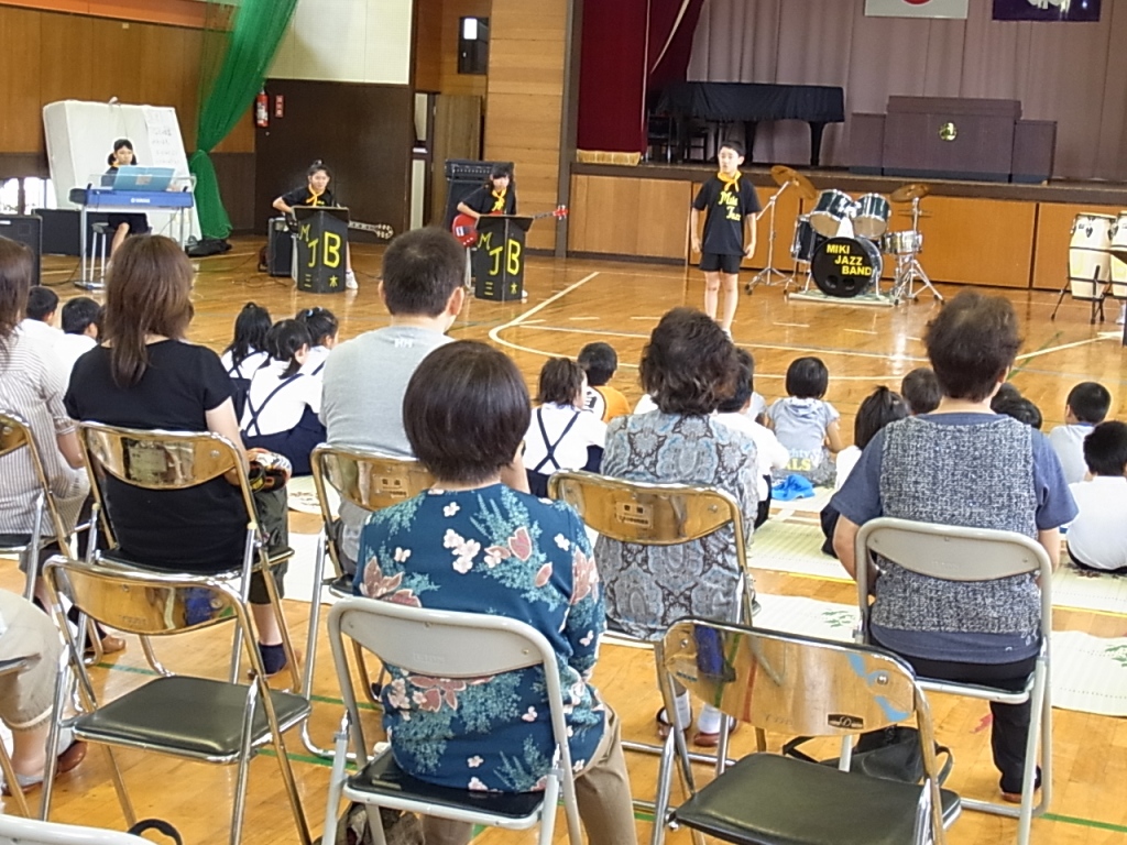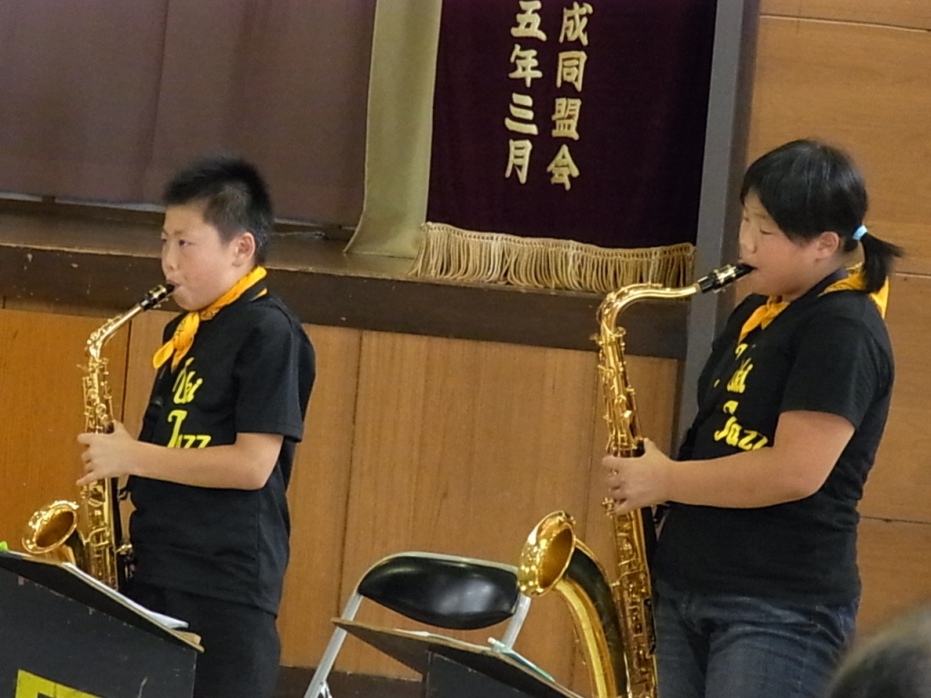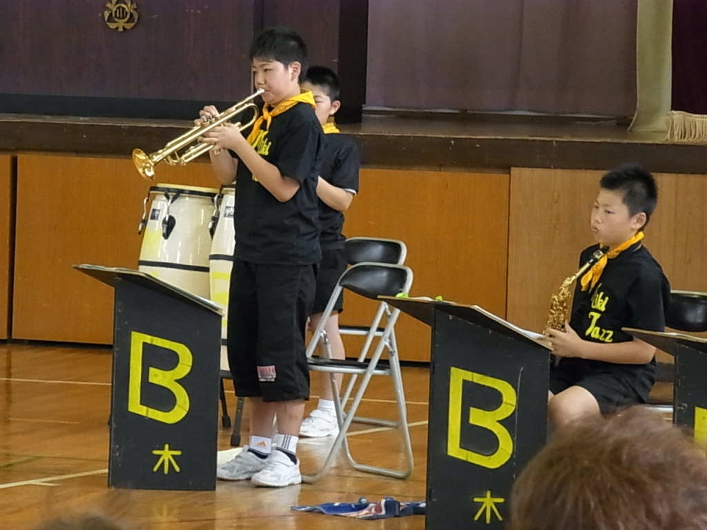 文化祭には学年の出し物のほかに、3~6年生の習字の作品や、1~6年生が図工で作ったいろんな作品が展示されています。発表の後、バザーや抹茶や、品評会が開かれます。カレーを食べるところや、豚汁を食べる所もあります。あんまりjazz.JPG遅い
