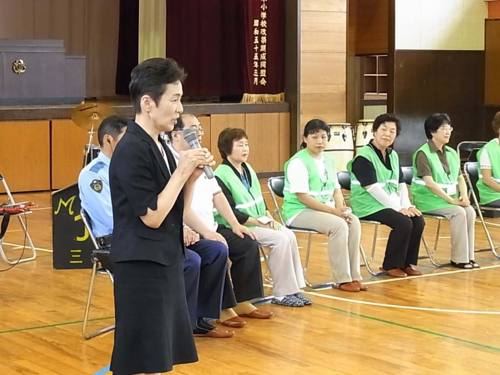 黄緑色のベストを着て毎日学校の校門前や地域の危険個所に立って児童の登下校を見守ってくださっている「三木の子見守り隊」の方々と対面式を行いました。