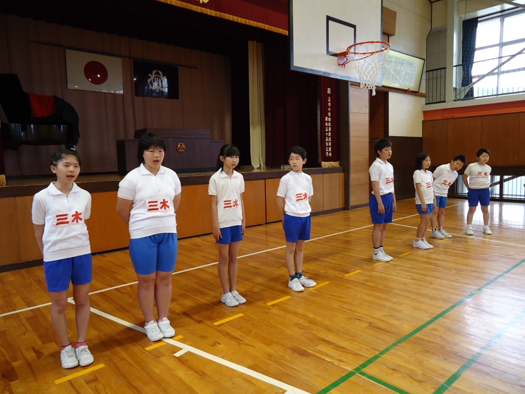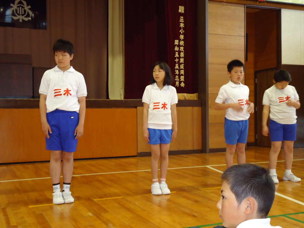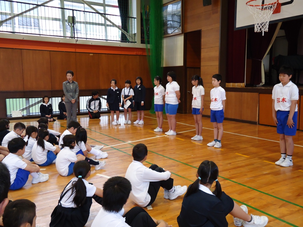 三木小学校には、三木校讃歌と校歌の2つがあります。電子黒板を使い、2つの歌が作られた経緯や歴史を話しました。そして、校歌の歌詞の意味についても説明しました。3題目まで、歌詞に込められた意味を確かめながら、大きな声で校歌を歌って集会は終わりました。