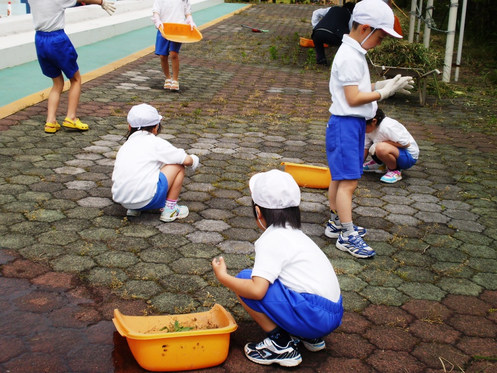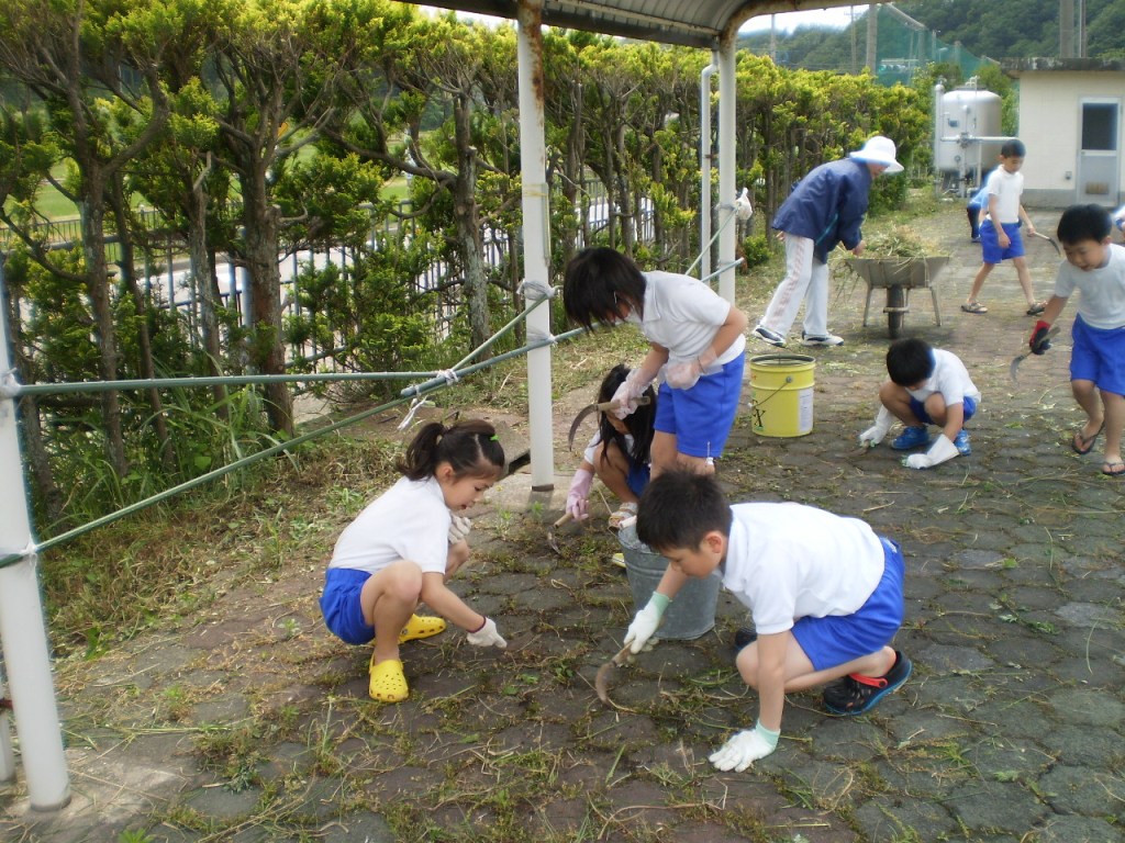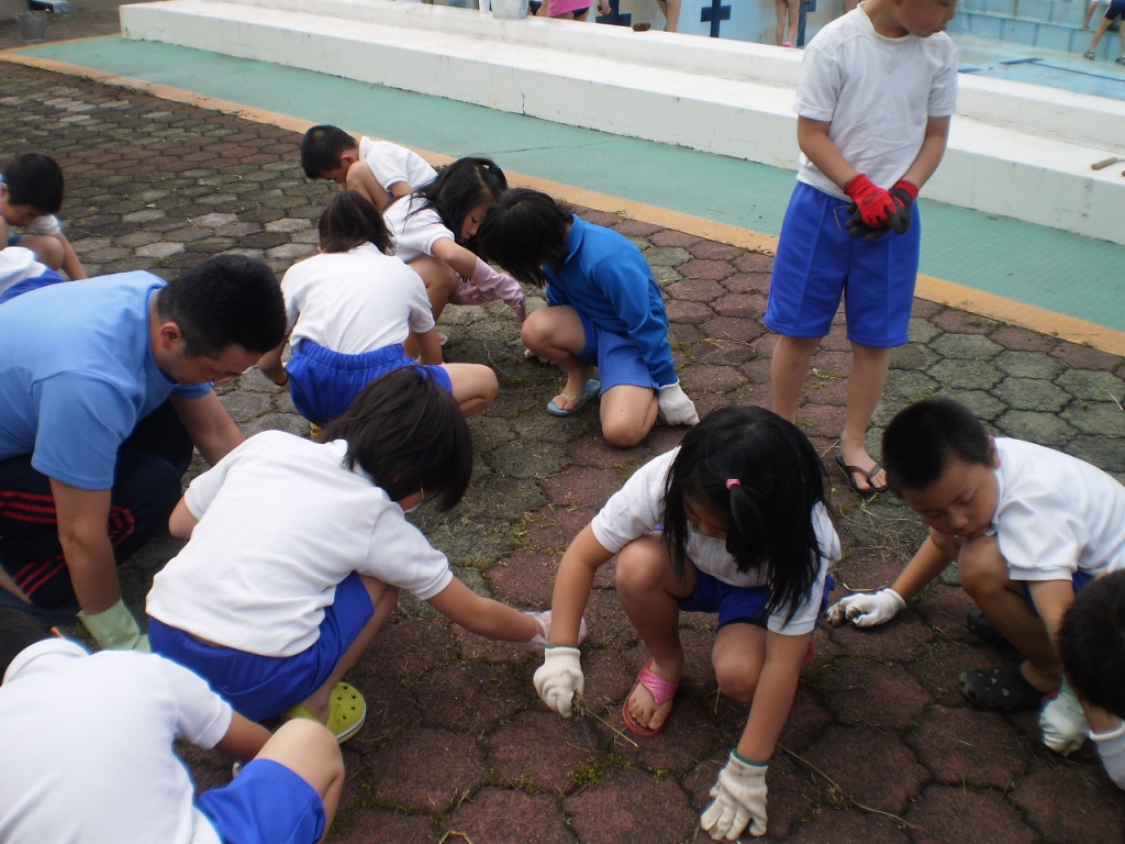 低学年は、プールサイドの草むしり、高学年は、プールの側面・底磨きをしました。