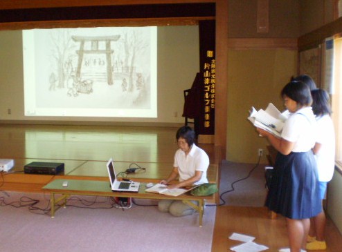 まず、児童会役員が「りん子ちゃんの8月1日」という富山大空襲を題材にした絵本をスクリーンに拡大して読み聞かせをしました。次に、竹本館長さんから戦争についてのお話を聞きました。絵本は、広島、長崎だけでなく日本各地で空襲などで多くの人々が亡くなったことがよく分かりました。館長さんからは、三木地区慰霊塔の中にも広島の原爆の犠牲者がおられる話や、長崎で被爆された石川県人の人たちが出版された手記を読み聞かせしてもらいました。会館横の慰霊塔にみんなで黙とうをささげました。