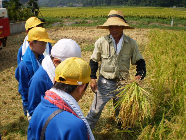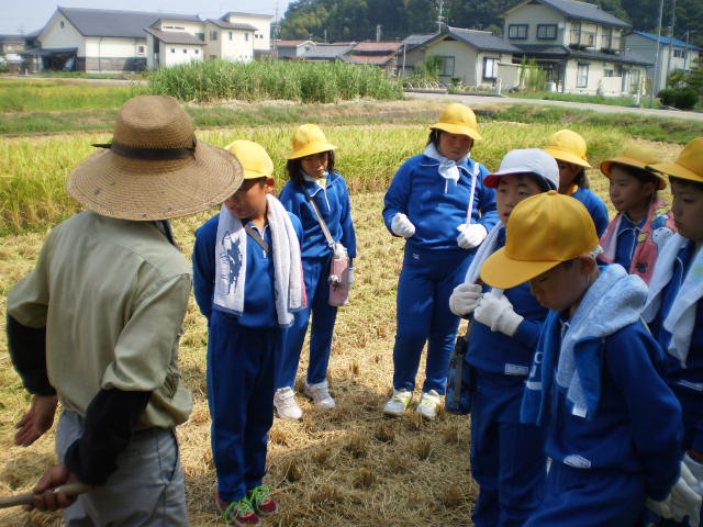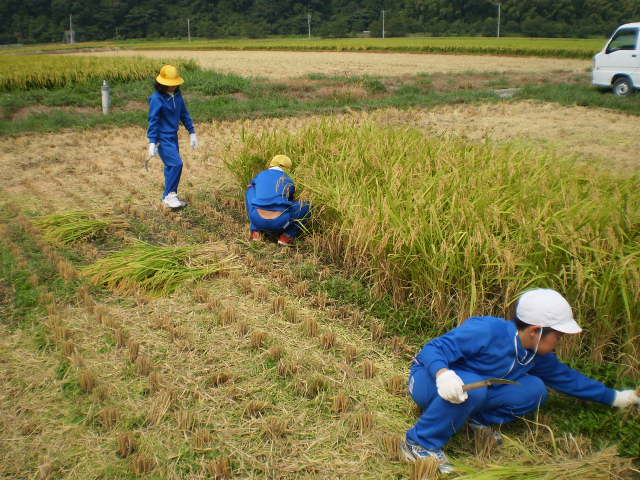 5年生が稲刈りをしました。春に、自分たちで田植えをした苗が、今年は猛暑が続き、稲の成育にはとてもよかったようです。初めに、Hさんから、稲刈りの注意点を聞いて、一人ひとり鎌をもち、稲を刈って行きました。とても暑くて、腰も痛くなり、農家の人たちの苦労がよく分かった貴重な体験になりました。きっとこれからはご飯を食べるときも、感謝しながら残さず食べることでしょう。
