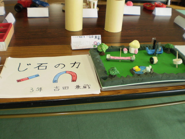 子どもたちが、夏休みに取り組んだ研究や作品が、視聴室に展示してあります。工作や手芸、自由研究などどれも力作ぞろいです。どうぞ、時間があったら見に来て下さい。