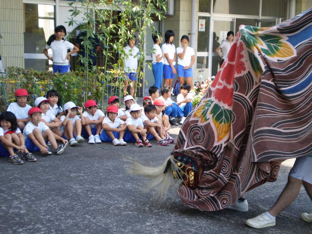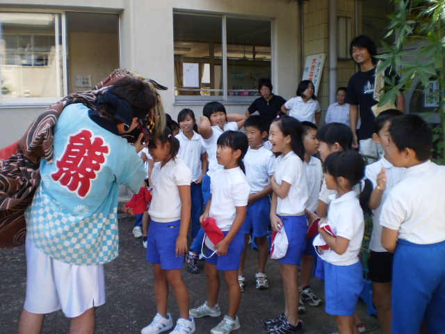 今日は、熊坂町のお祭りで、獅子舞が学校にやって来ました。ちょうど、長休みの時間だったので、全校児童が玄関前に出て見ました。獅子の踊りが佳境に入り、動きが速くなり目の前に近づくと「キャー」と歓声を上げて、大喜びでした。最後に、獅子に頭を噛んでもらっていました。秋晴れの大変気持ちの良い日でした。