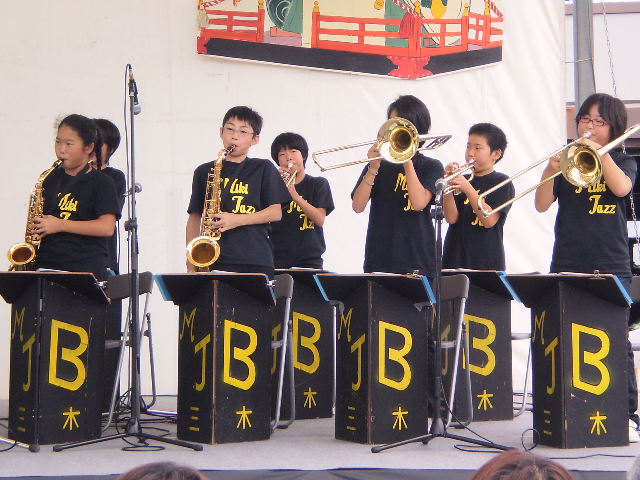 文化祭には学年の出し物のほかに、3~6年生の習字の作品や、1~6年生が図工で作ったいろんな作品が展示されています。発表の後、バザーや抹茶や、品評会が開かれます。カレーを食べるところや、豚汁を食べる所もあります。あんまりjazz.JPG遅い