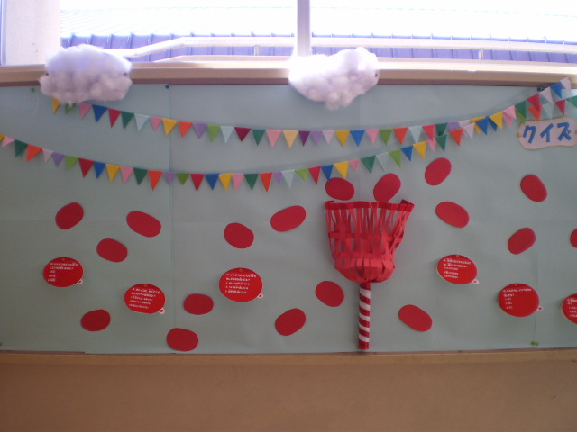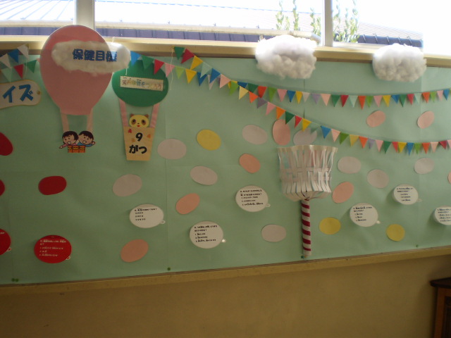 9月の保健目標は「丈夫な体をつくろう」です。運動会も間近なので、玉入れの玉を使かって体に関するクイズを作り、掲示しました。秋の青空のように、健康に毎日が送れるといいですね。