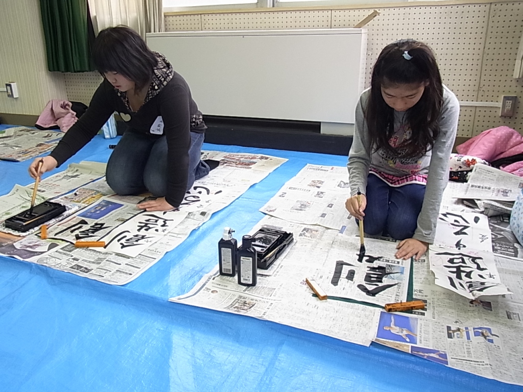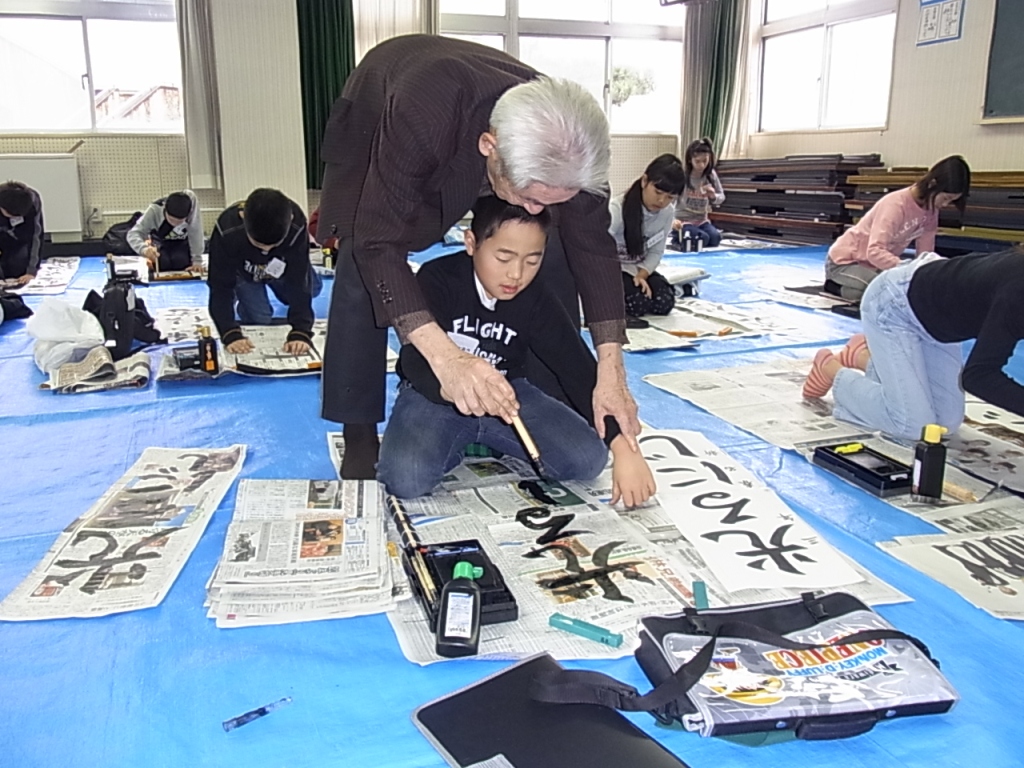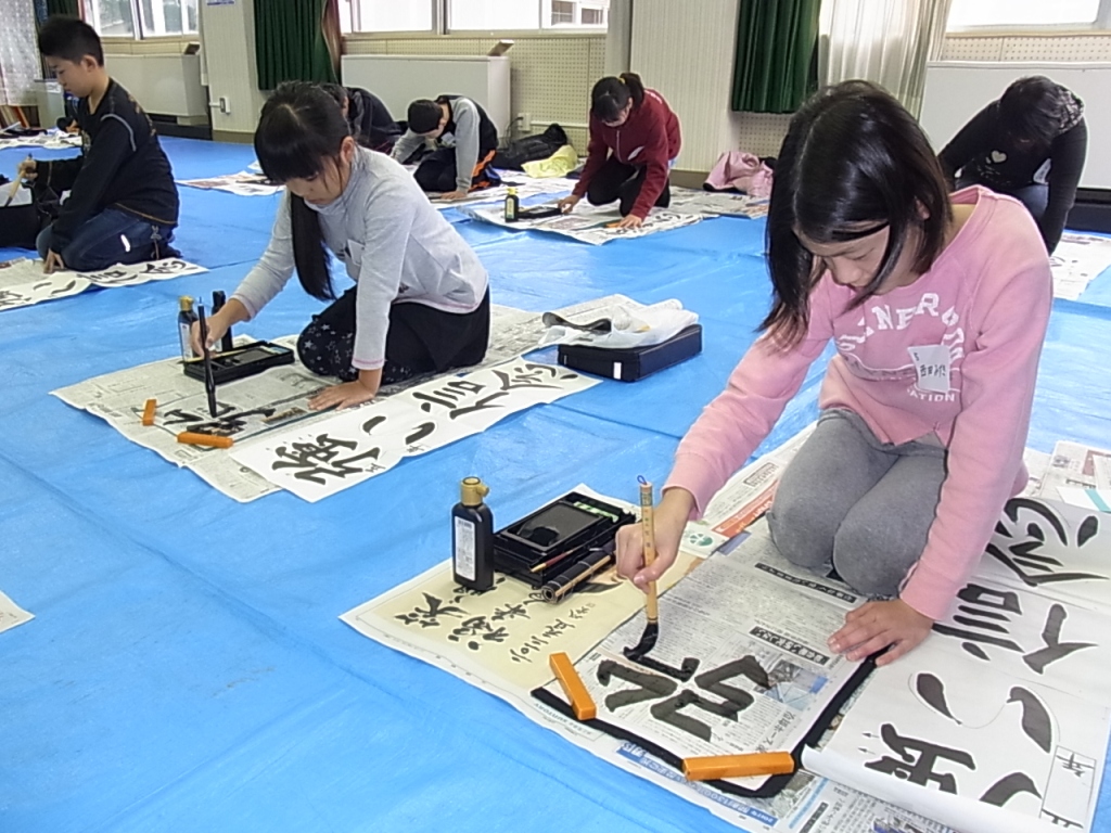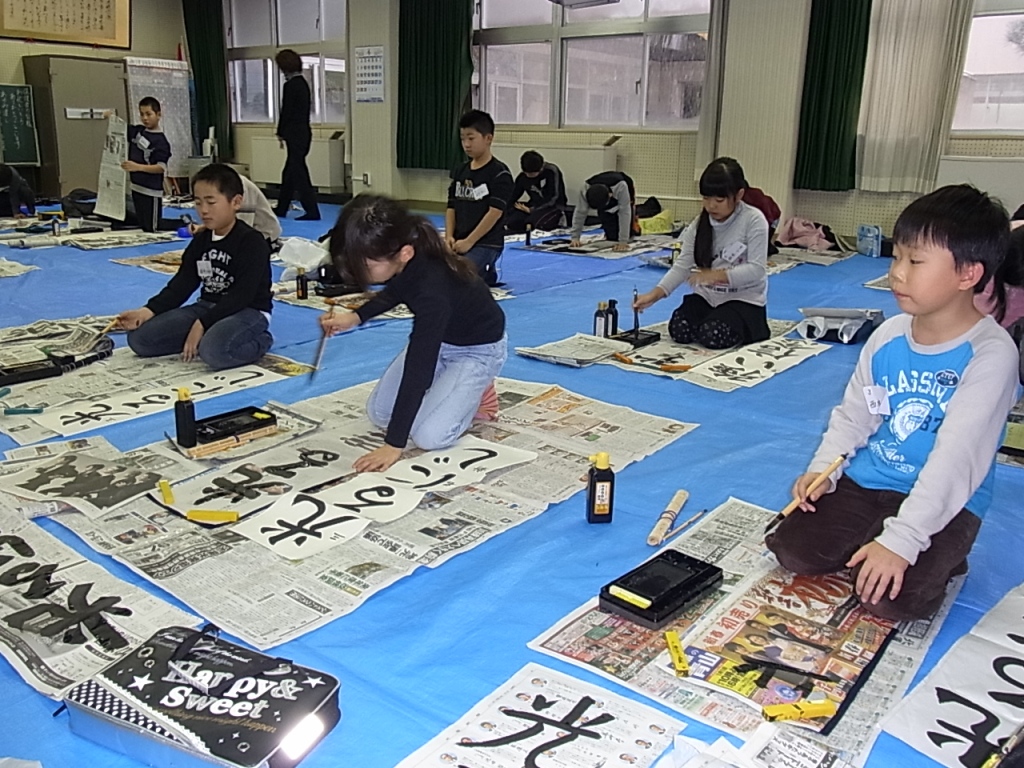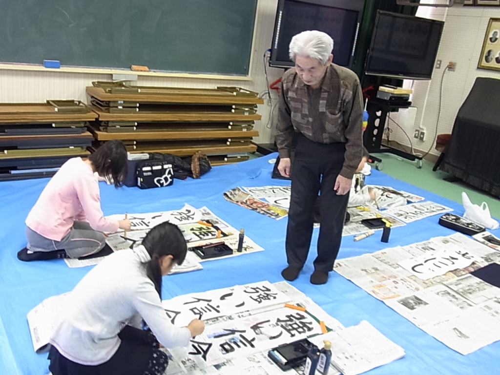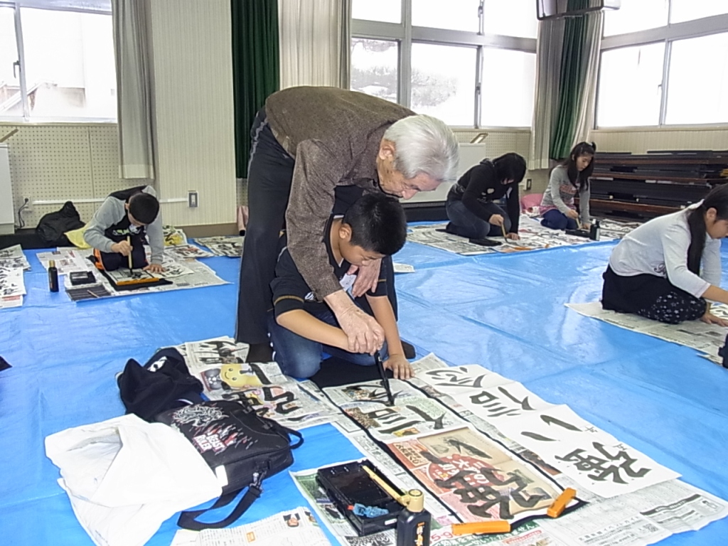 4日から、毎年恒例の書き初め練習が始まりました。希望者が、三木校区の三瀬先生から指導を受け、5日間練習します。初日は、三と言う漢字の横画を何度も何度も練習し筆運びや、始筆、終筆などの基本練習を2時間掛けて練習していました。