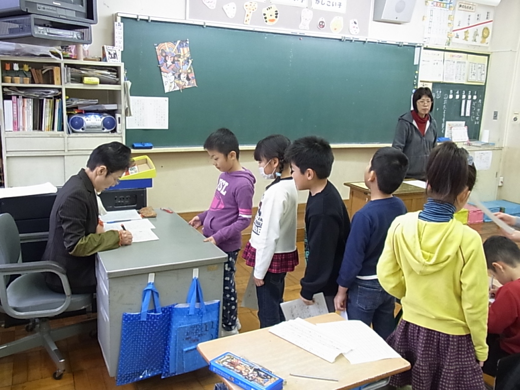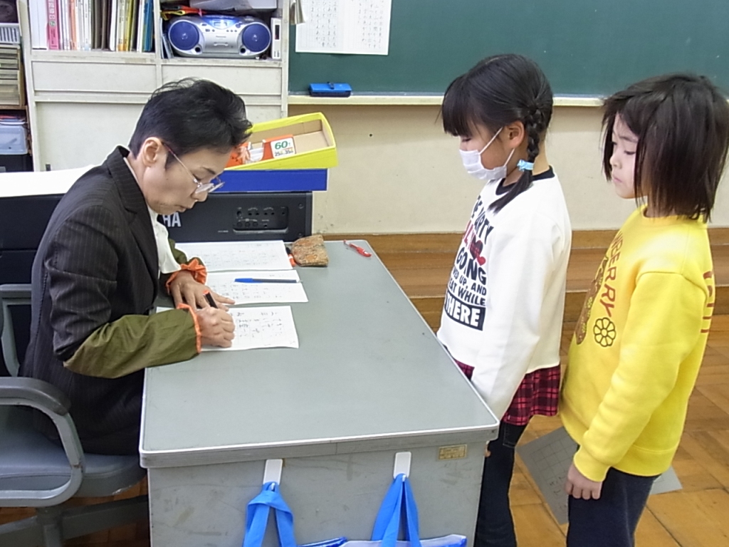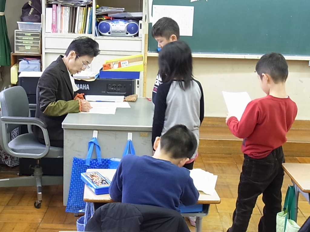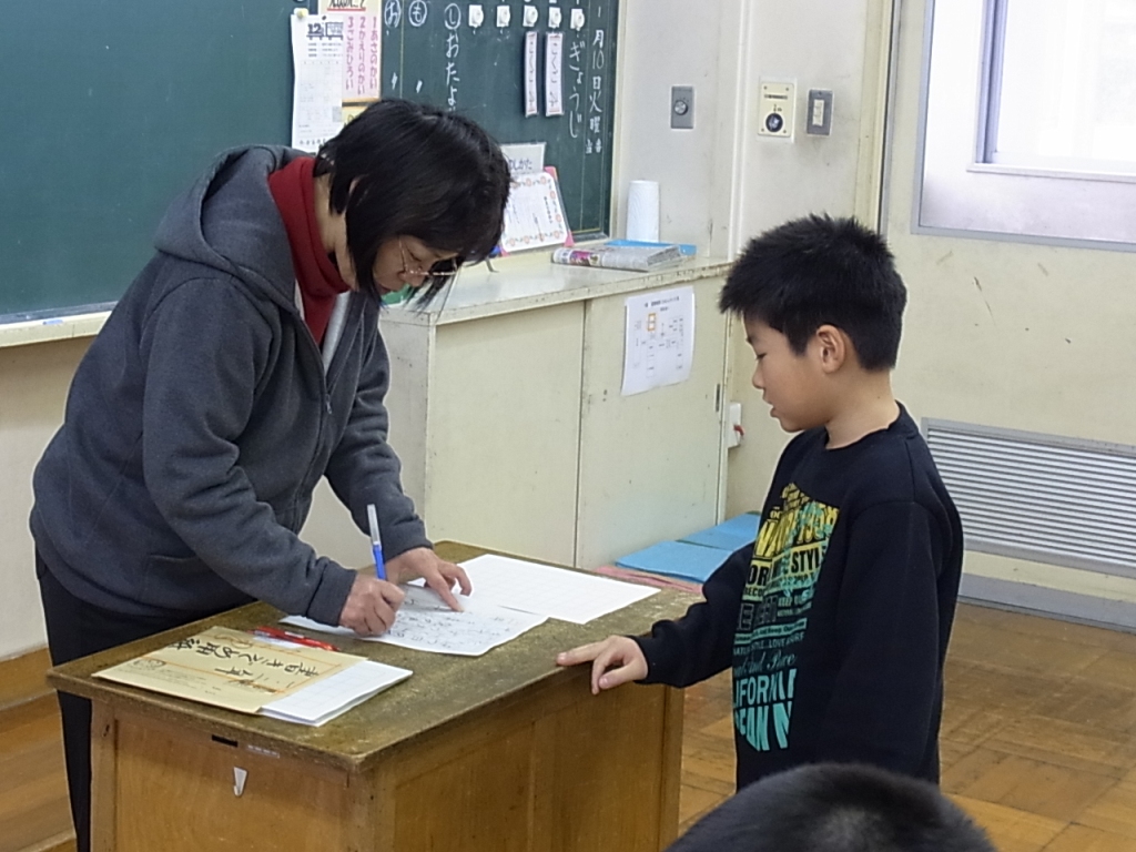 1・2年生は、硬筆書写の書き初め練習に来ています。参加は希望者ですが、ほとんどの子が来校し、ストーブを付けた1年教室は真剣に手本とにらめっこする姿でシーンとしています。