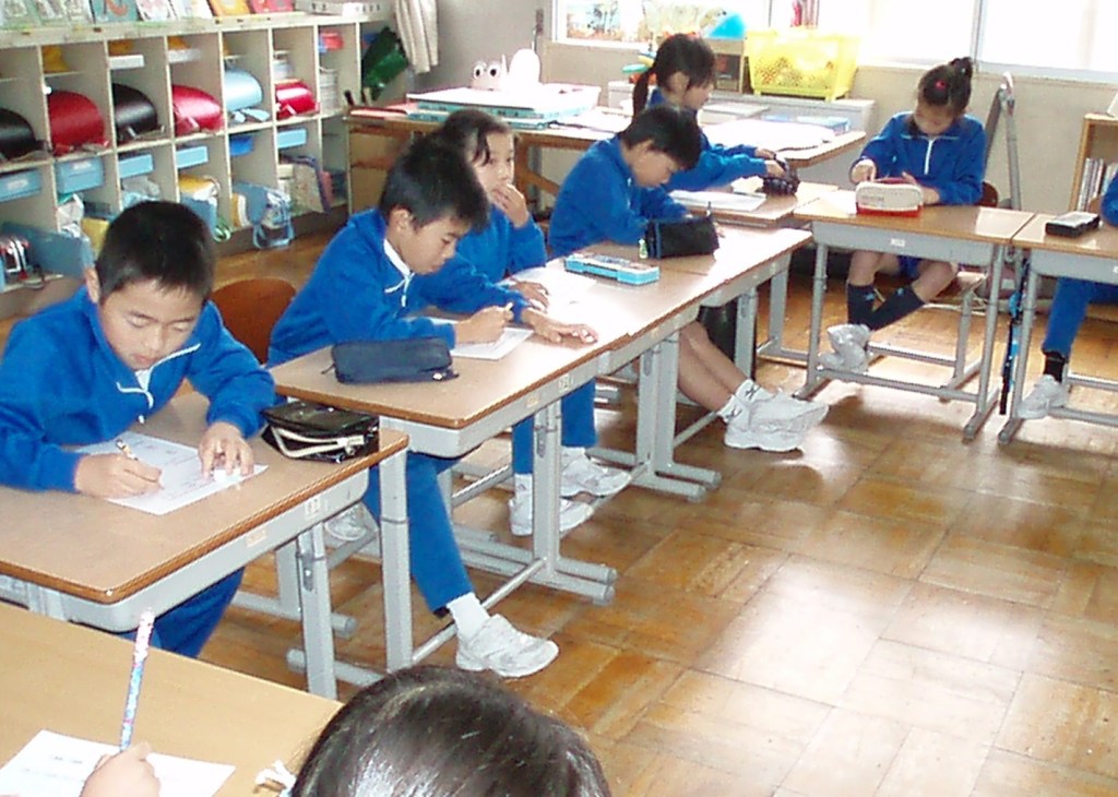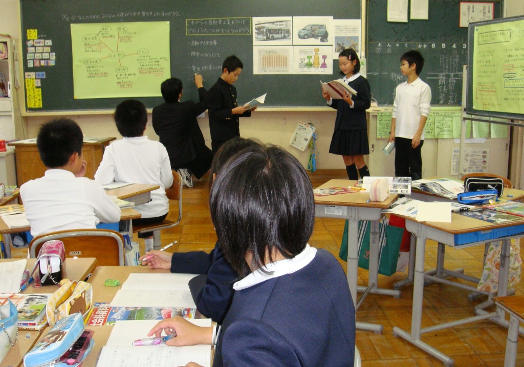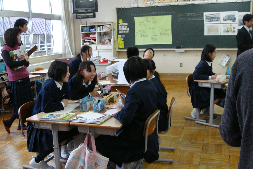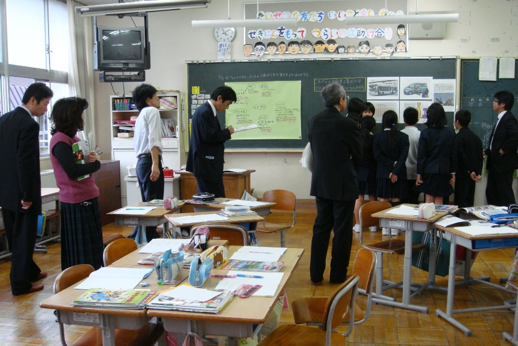 今日の午後は、市内の先生方がいろいろな学校へ出かけて授業をみて勉強する会でした。5年生は、5限に市内の社会科部員の先生方、10人ほどに授業を見てもらいました。「自動車を作る工業」という単元で、先日のJバス工場見学や各種の資料をもとに大変意欲的に話し合い、学び合っていました。