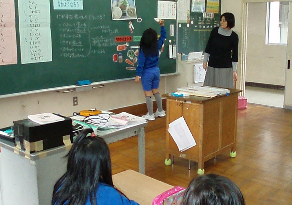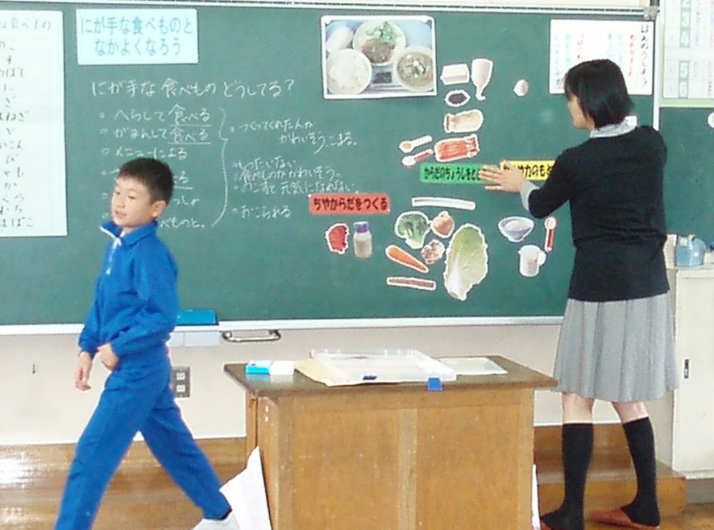 「苦手な食べ物をなくそう」というテーマで食育授業をしました。事前にアンケートをしたところ、嫌いな食べ物は、キノコ類と、なすび、梅干しなどでした。大切な栄養について学習に、苦手克服対策を考えました。