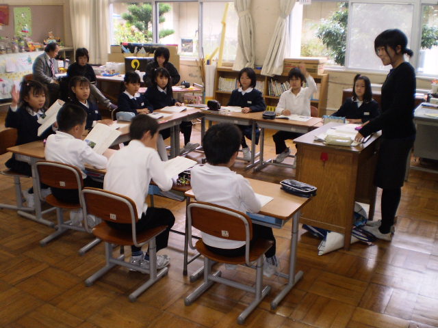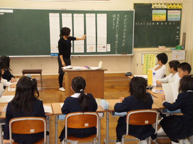 3年生が国語の研究授業をしました。「すがたをかえる大豆」の説明文です。大豆をおいしく食べるために、きなこや豆腐、味噌、しょうゆなどいろいろな食品にすがたを変えている③段落から⑦段落を読み取る授業でした。授業後の整理会で、ねらいに迫る指導ができたかどうかみんなで、協議しました。