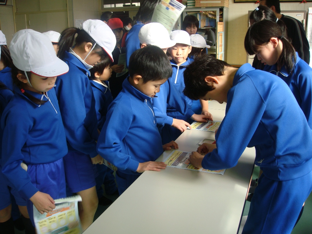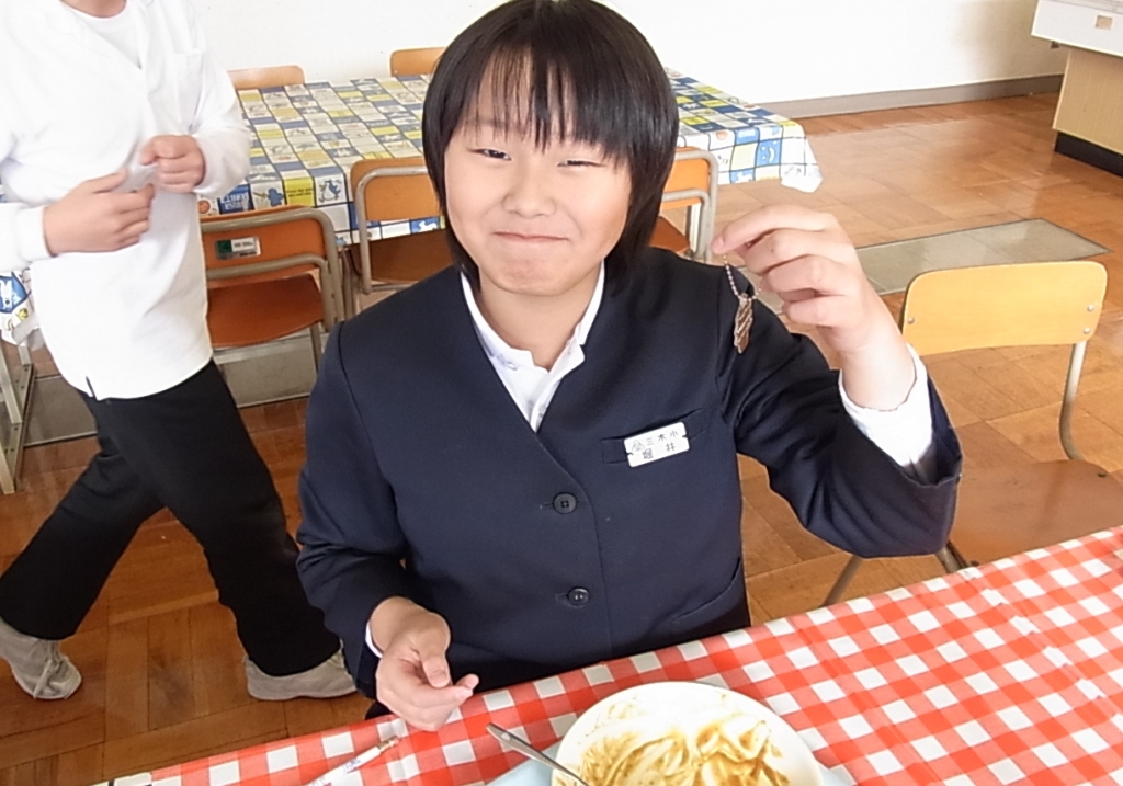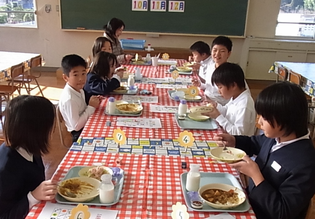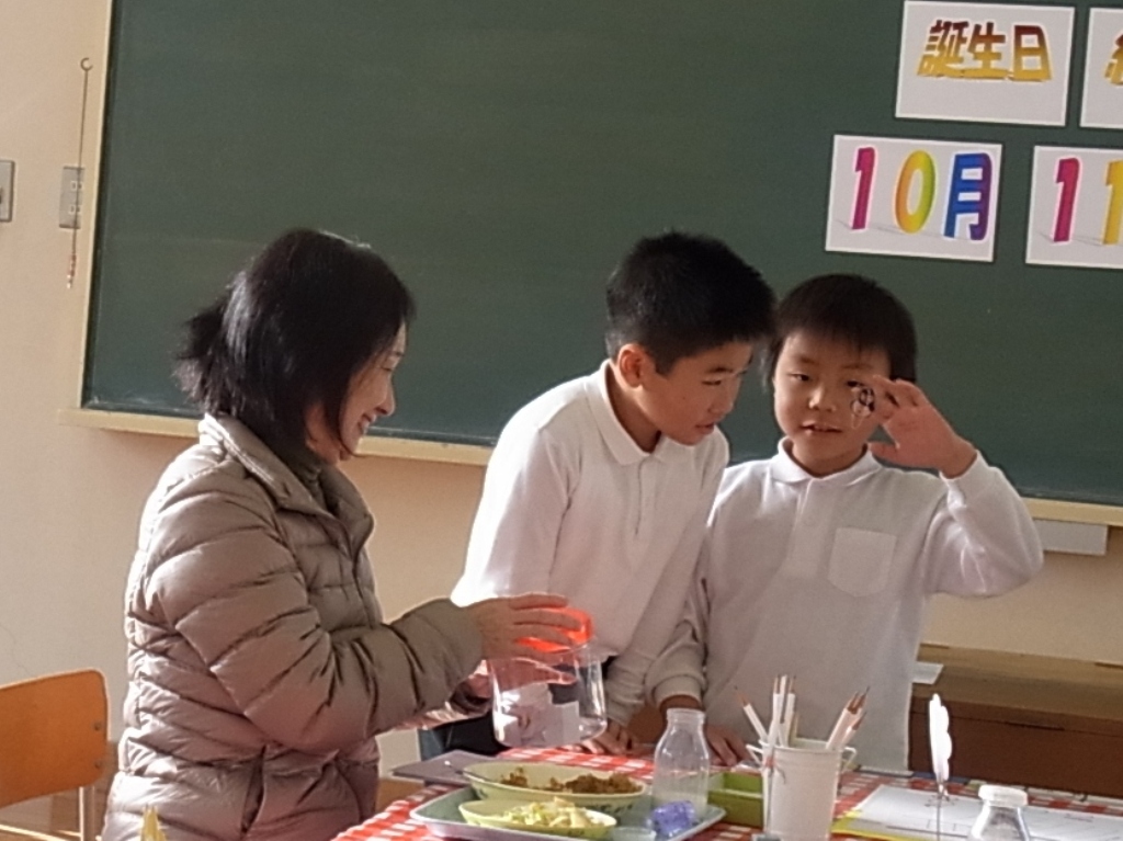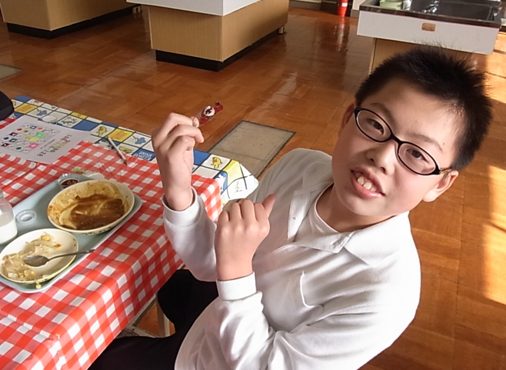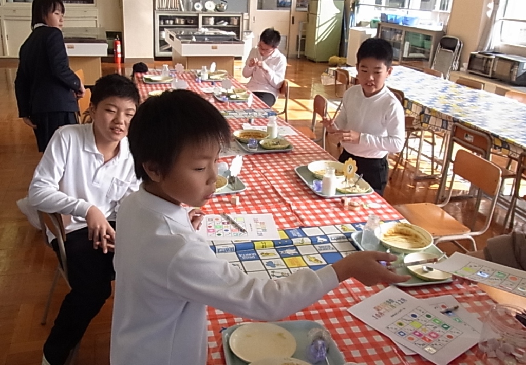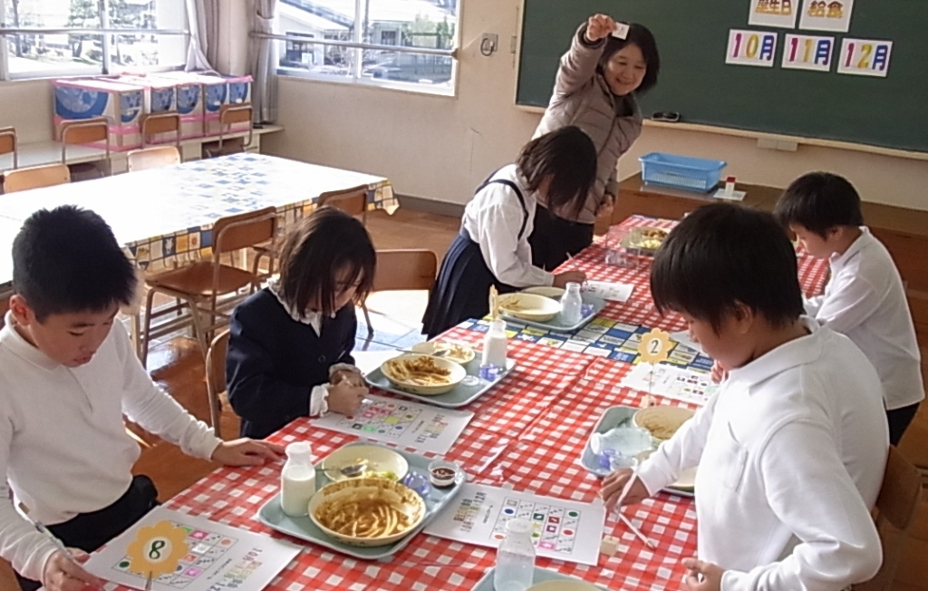 10・11・12月生まれの児童と先生が一緒に給食を食べる「誕生日給食会」をしました。まず「私の誕生日は12月16日です。8歳になりました。好きな遊びはブランコです。」と一人ずつ自己紹介をしました。お祝にデザートが1つ普段より多くつきました。名前ビンゴゲームをして、ビンゴになったら、s先生手作りのプラバンキーホルダーが当たりみんな嬉しそうでした。小さな学校ならではのアットホームな取り組みです。3か月ごとに、誕生日の人が集まってお祝いします。最終回は1・2・3月生まれさんです。楽しみですね。