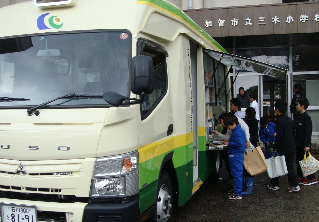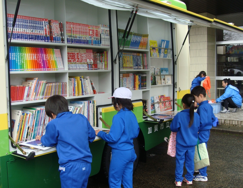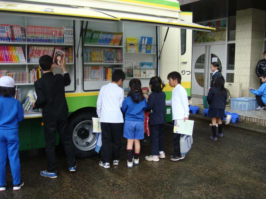 昼休みにかもまる号が来ました。1年生から6年生まで全員、絵本バッグとカードを持ってやって来ました。以前の車は老朽化のため、今月から新車に変わりました。一人、2冊3冊と思い思いの本を選び次々借りていました。レッツ読書キャンペーンカードにスタンプを押してもらい嬉しそうでした。