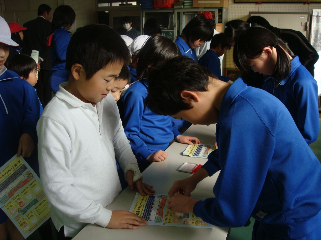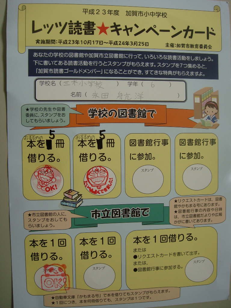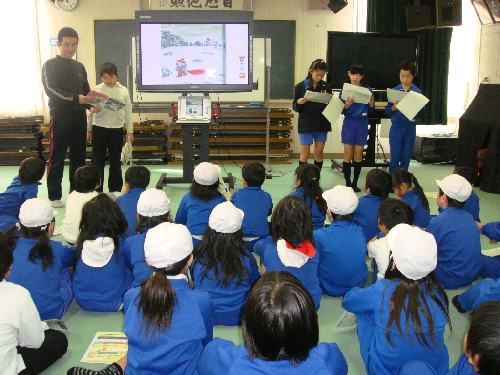 昼休みに図書委員が、大型テレビを使って読み聞かせをしてくれました。今の季節にピッタリの「あかいそりに乗ったウーフ」というお話しでした。みんな夢中で聞いていました。図書委員会の行事に参加すると「レッツ読書キャンペーンカード」にスタンプが押して当たります。みんな嬉しそうにカードにスタンプを押してもらってました。