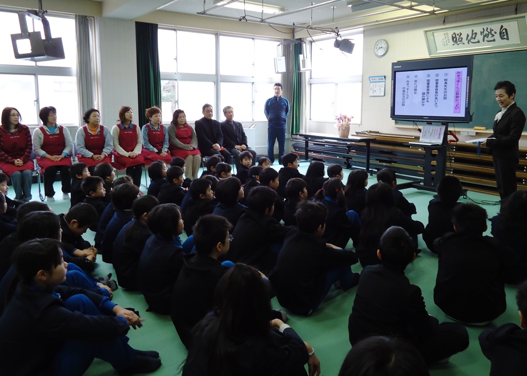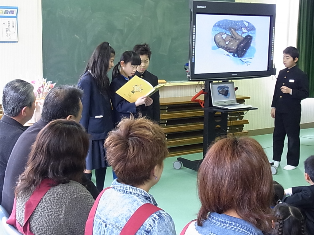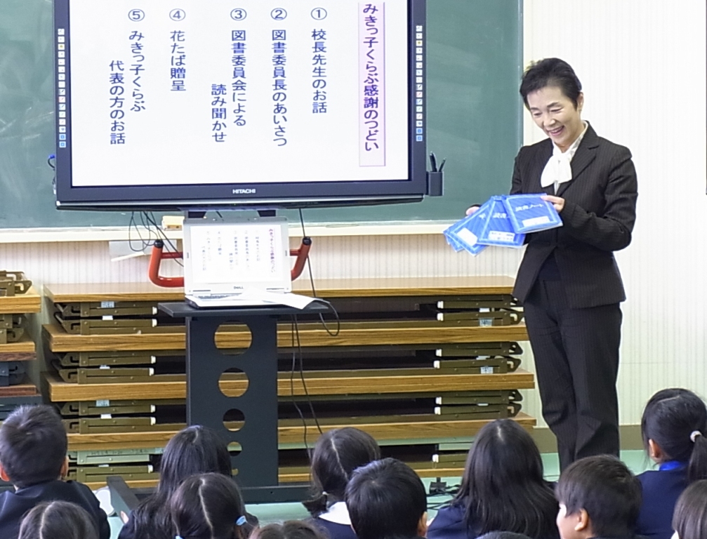 毎月第一木曜日の朝に、読み聞かせをしていただいている「みきっこくらぶ」の方々に、感謝の会を開きました。図書委員会が電子黒板を使って読み聞かせをした後、お礼の言葉とお花を送り、感謝の気持ちを伝えました。