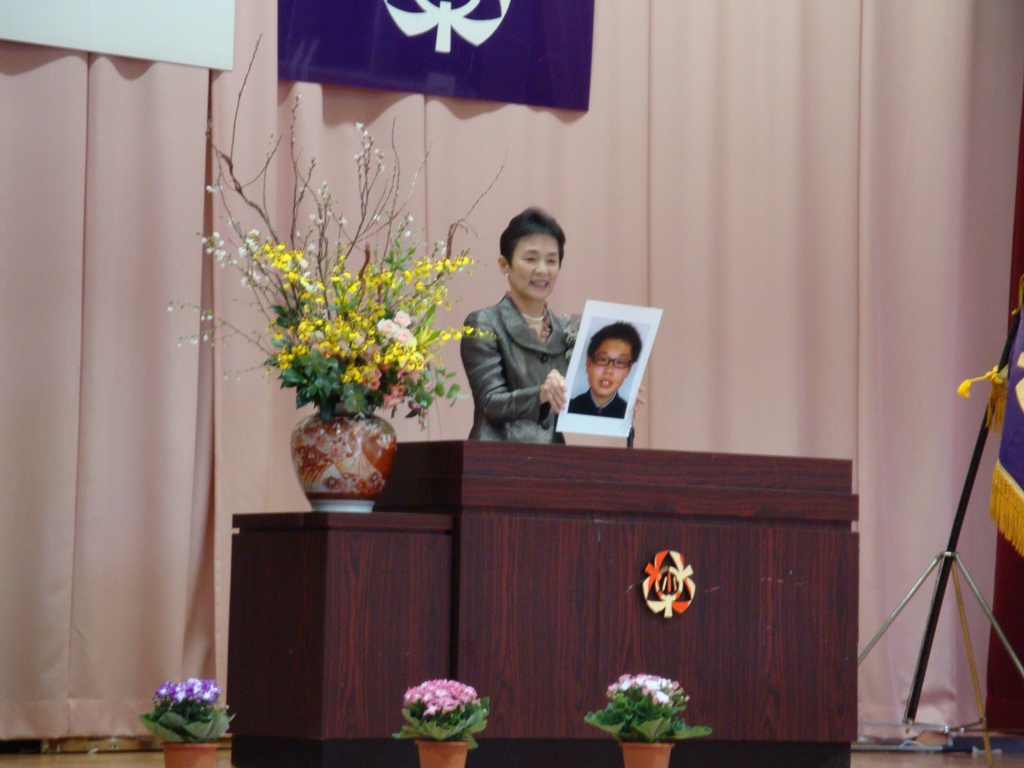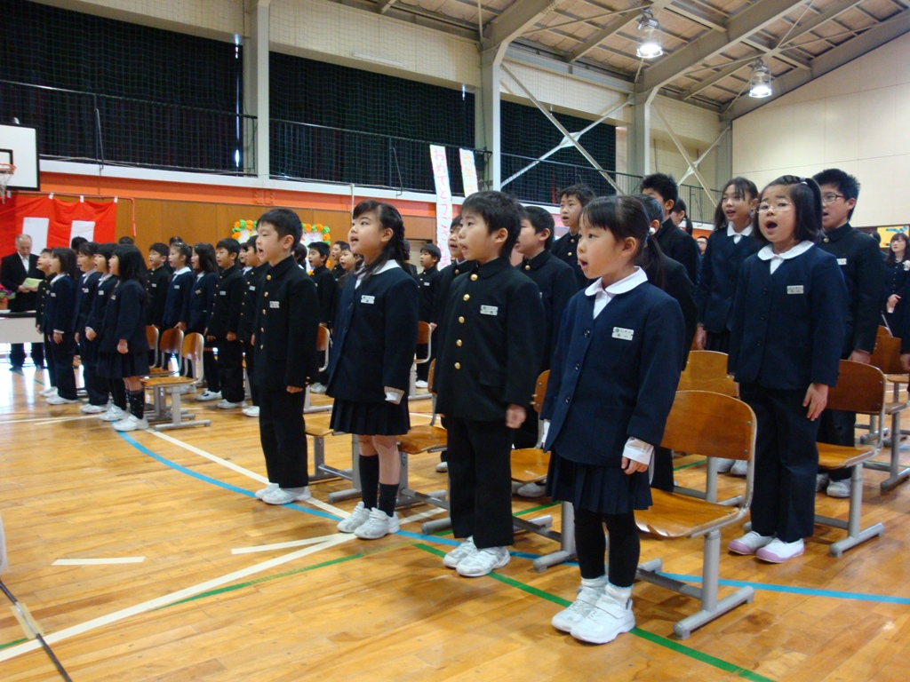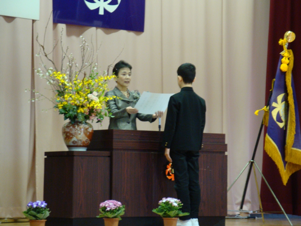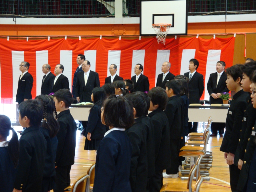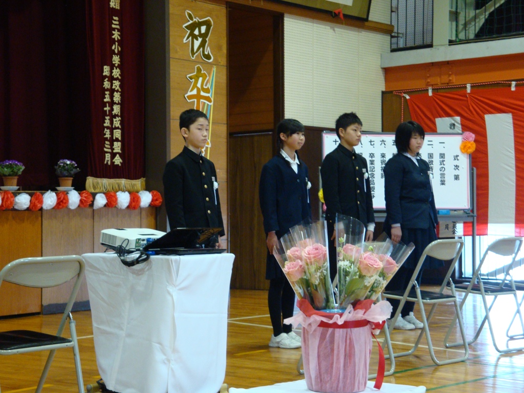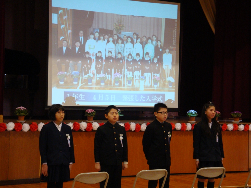 やわらかな春の日差しの下、卒業式が行われました。8名の卒業生は、立派な態度で式に臨みました。大型スクリーンに6年間の思い出の写真が次々と映し出され、お別れの言葉を呼びかけました。在校生も大きな声で歌や言葉を言いました。