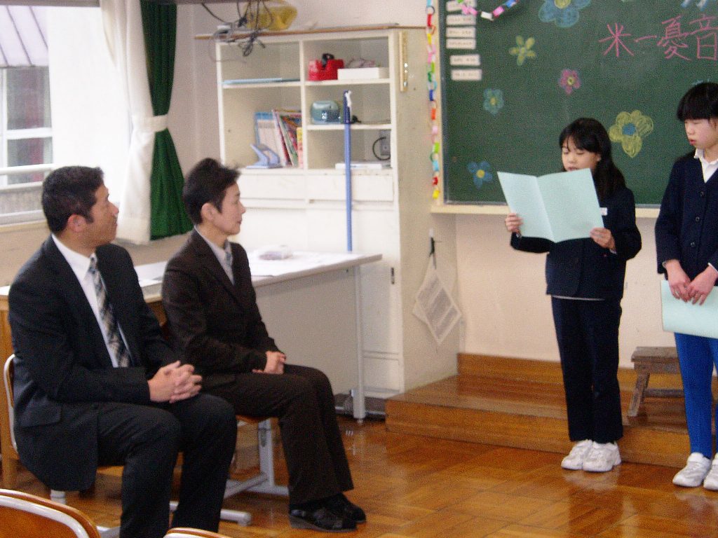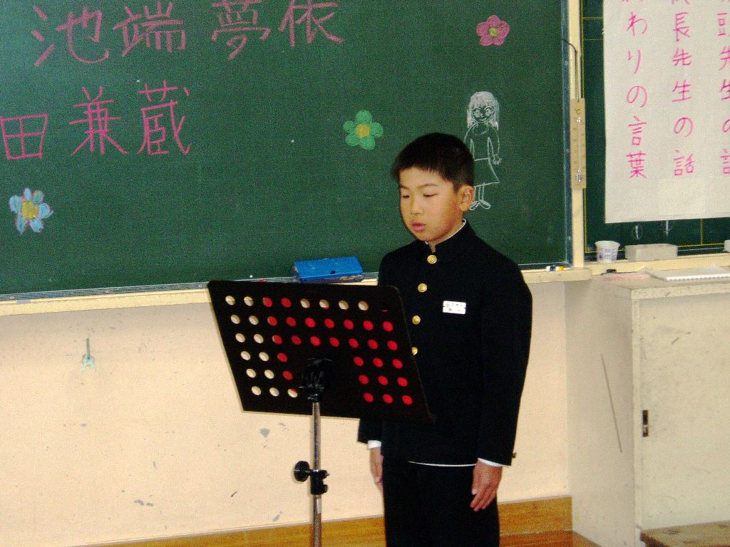 担任から、一人ひとりの通知表を見せてもらい、全員が良く頑張ったことを嬉しく思うことや、読書ノートで400冊以上読んだベスト3の子の紹介や、校報「三木の子」を1年間配達してくれた子への感謝等を伝えました。