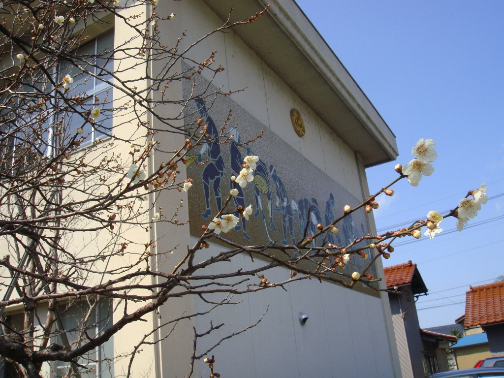三木小学校の校舎の前の梅は、樹齢が古くずっと校舎を見守って来ました。寒い春ですが、先日、うぐいすの初音を聞きました。