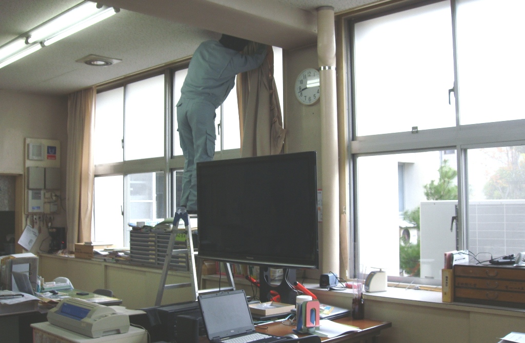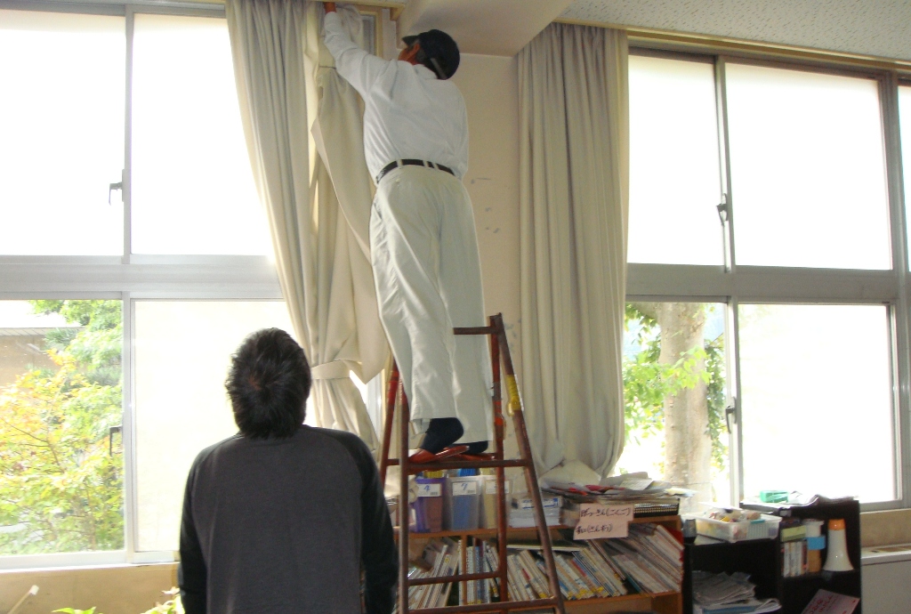 教室が空なのを利用して、シルバー人材センターの方に、カーテンを取り外してもらいました。何年も洗ったことのないカーテンは、埃で真っ黒でした。それを、校務員さんが、洗濯機で次々洗い、また、教室に取り付けました。