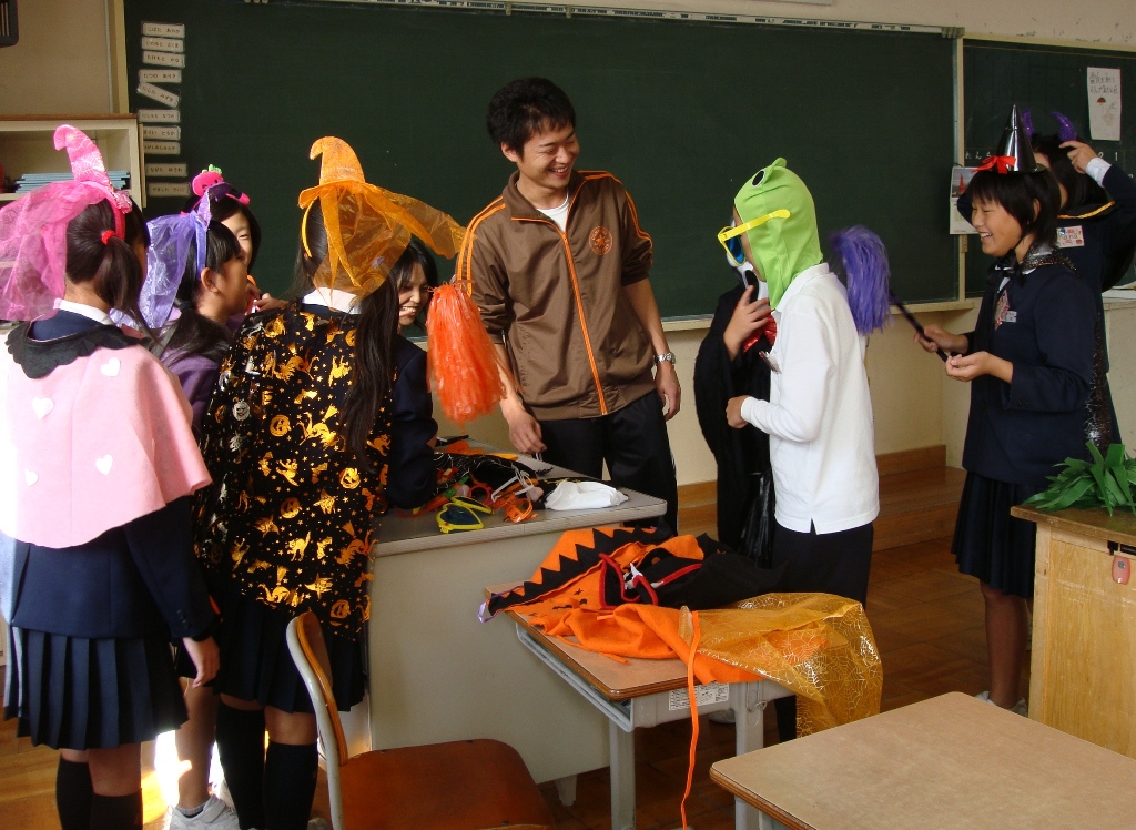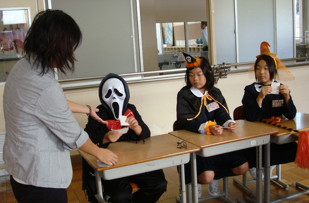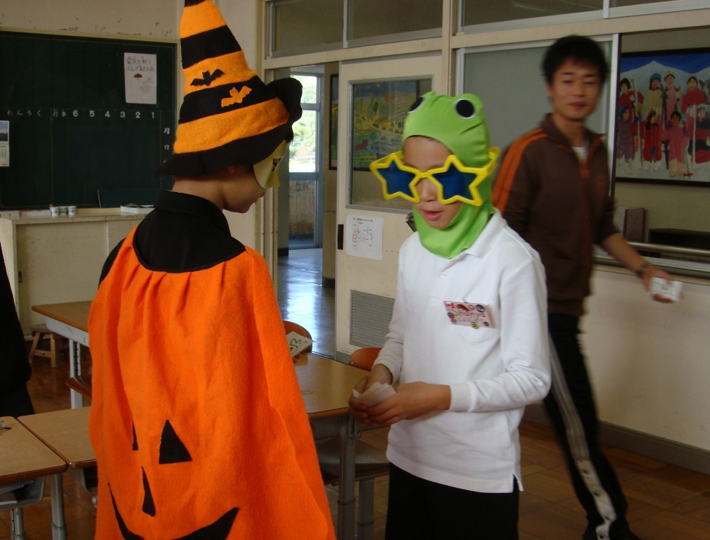 イギリス人のミリさんの他に日本人のSさんも英語のALTとして三木小学校に来て下さっています。10月31日は、イギリスやアメリカでは、子どもたちが仮装してキァンディーをもらうハロウィンがあります。今日は、Sさんが準備してくれた衣装でふん装して英語でじゃんけんしながらキャンディーカードを集めるゲームをしていました。とても楽しそうにゲームをしていました。