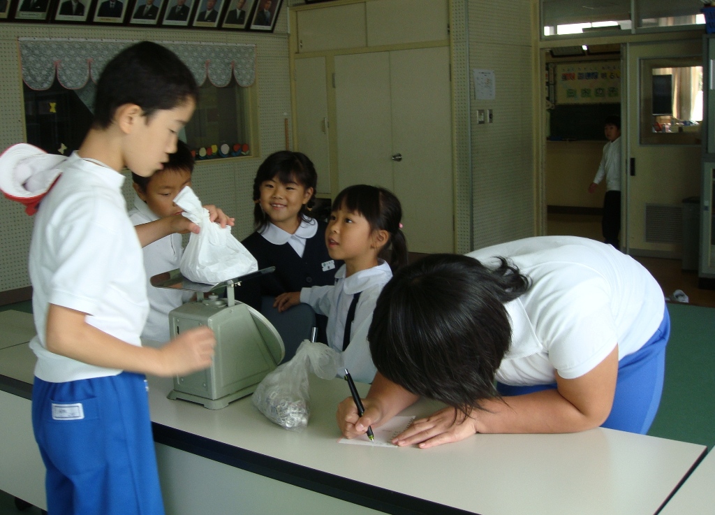 毎週水曜日の長休み時間に、プルタブ回収をしています。委員が学年ごとに重さを測り昼休みに放送で伝えています。4月から、子どもたちはせっせと持ってきてくれます。4月から集めたプルタブはもう、大きな段ボールに2箱たまりました。3月には、児童会代表が社会福祉協会へ届け、車いす購入の資金にしてもらいます。