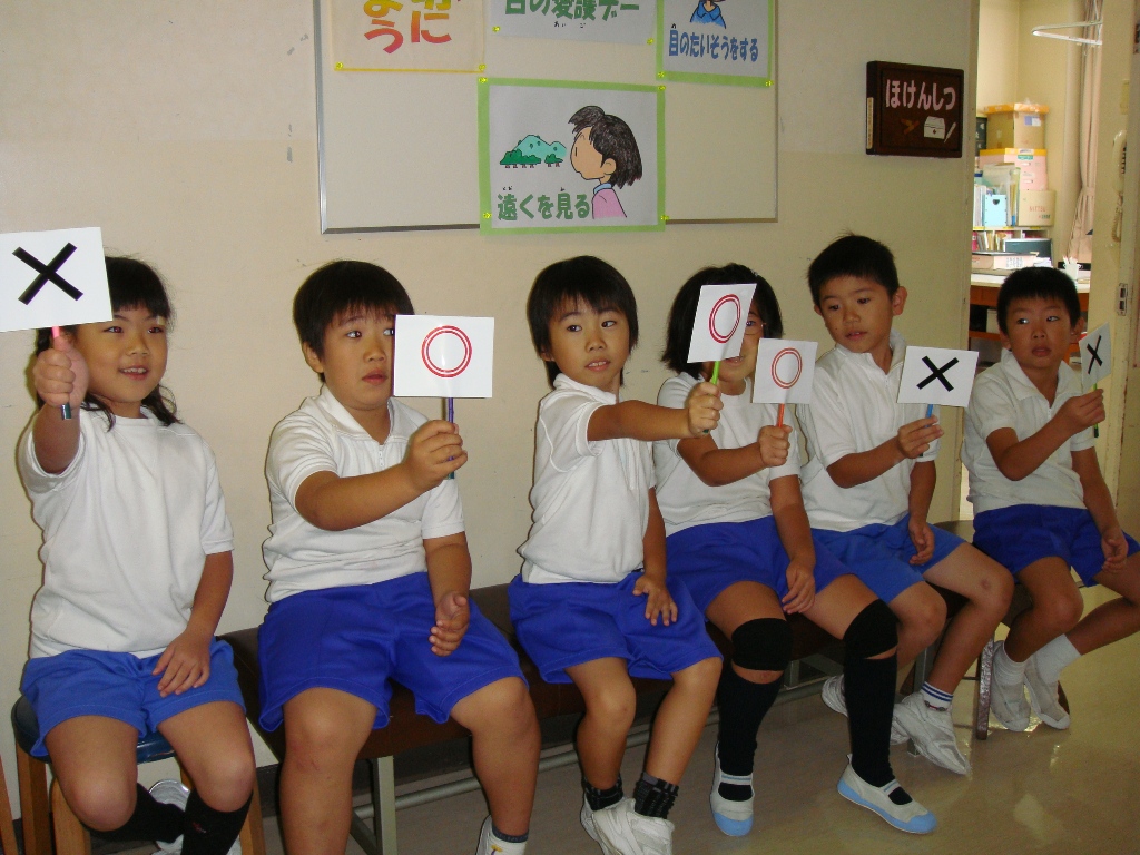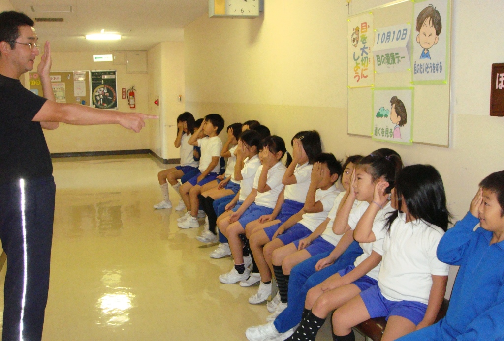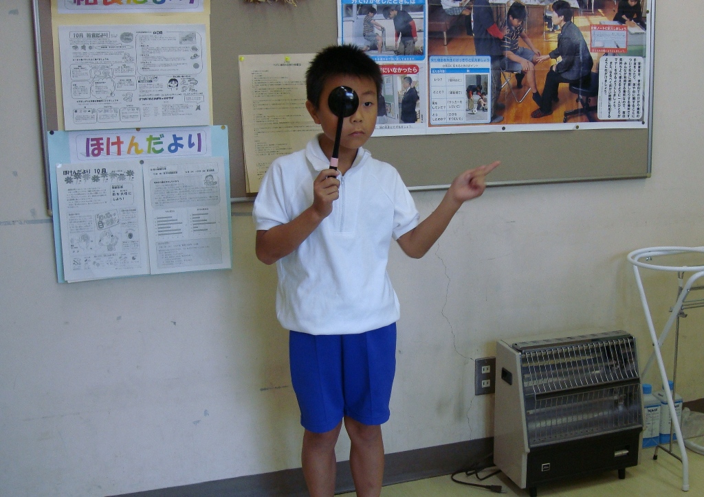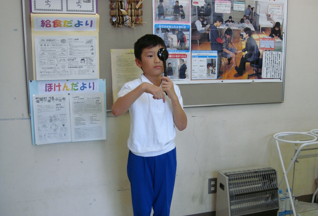 1年に2回視力検査をしています。10月10日の目の愛護デーを受けて、春より視力が落ちていないか調べるためです。養護の先生が、検査の前に簡単な目のクイズをし子どもたちは楽しそうに答えていました。テレビ視聴の仕方や視力低下の原因などを学んでいました。