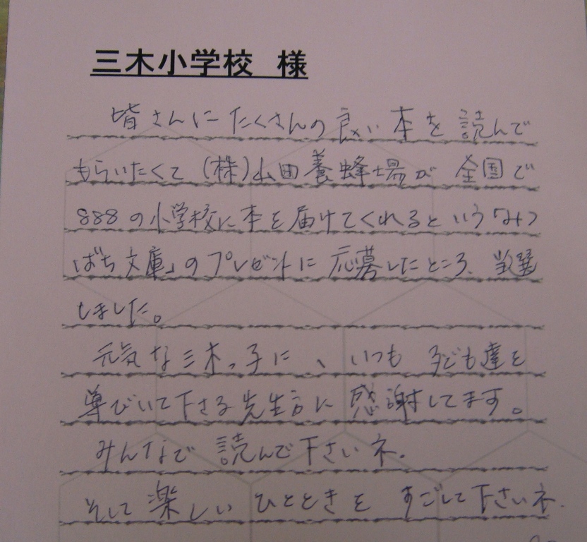 保護者のOさんが三木小学校のために「みつばち文庫」の『あなたが是非贈りたい母校やゆかりのある小学校』という本の寄贈に応募され見事、三木小学校が当選しました。