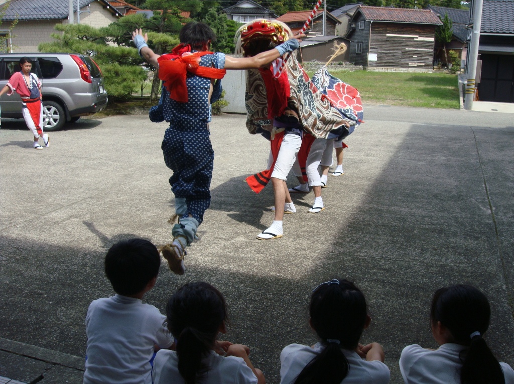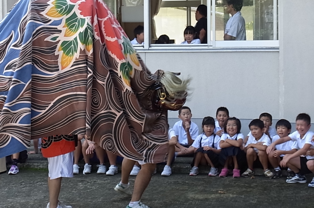 9日の昼休み、熊坂町の獅子舞が学校にやってkました。まるで獅子が生きているように動くので、低学年は怖そうな顔で見ていました。最後に、獅子頭に頭を噛んでもらいました。