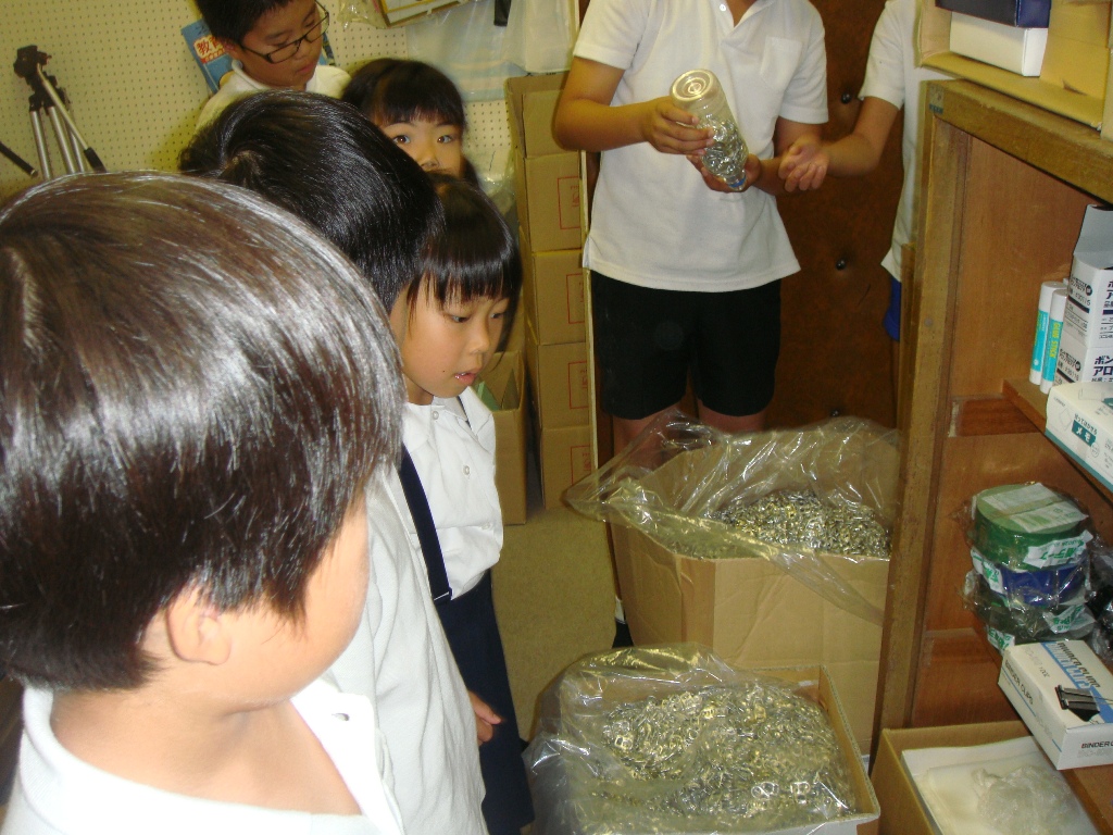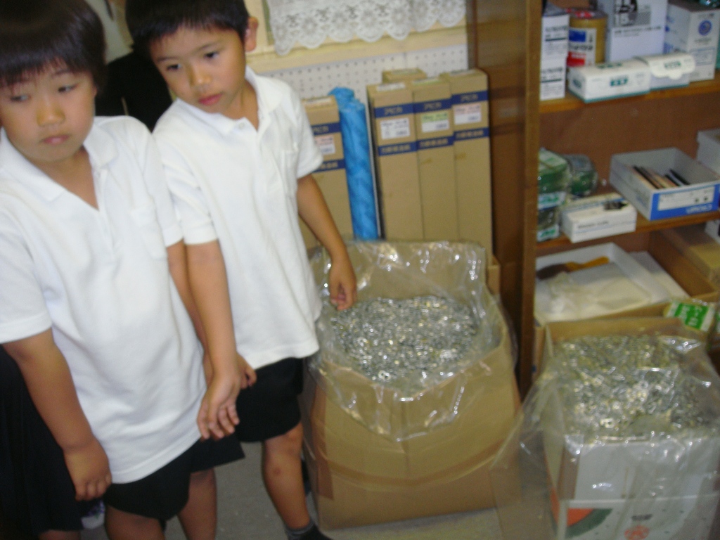 長休み時間に、放送で呼びかけると、家から持ってきたプルタブの袋を手に集まって来ます。