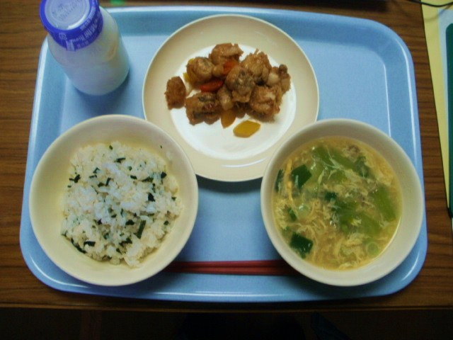 ★メニューはわかめご飯、白身魚とビーンズの甘辛、蛋白湯